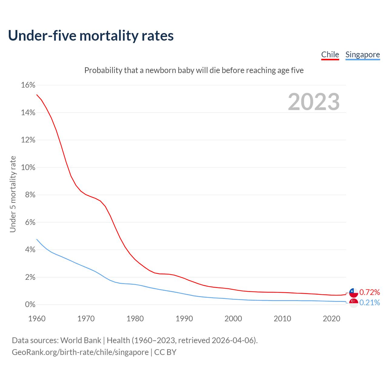 The chance that a newborn baby will die before reaching age five is 0.72% in Chile and 0.21% in Singapore. Above is a chart with historical data on under-five mortality rates.