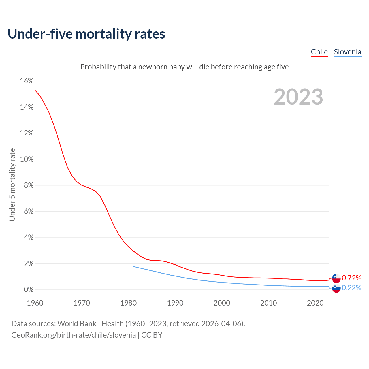 The chance that a newborn baby will die before reaching age five is 0.72% in Chile and 0.22% in Slovenia. Above is a chart with historical data on under-five mortality rates.
