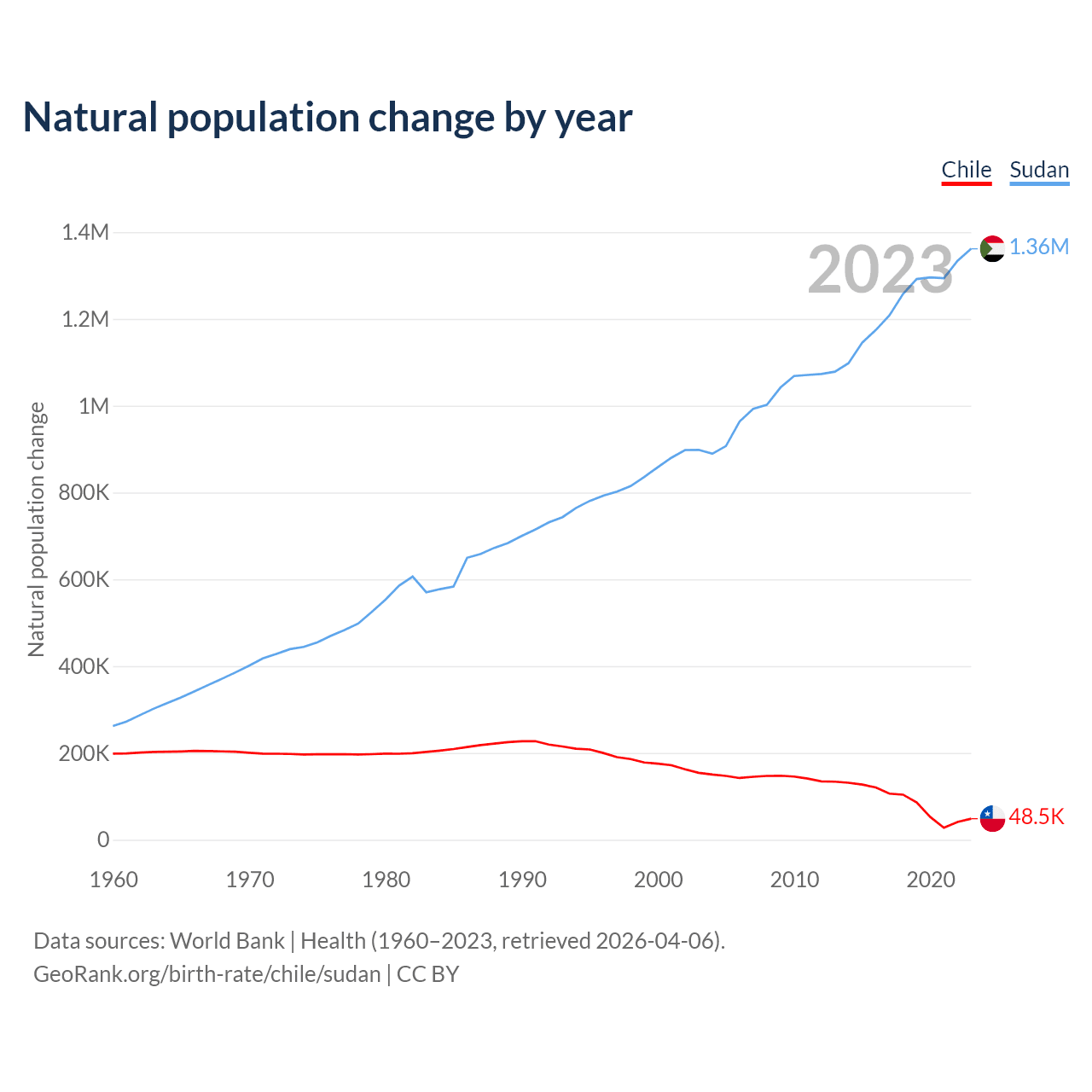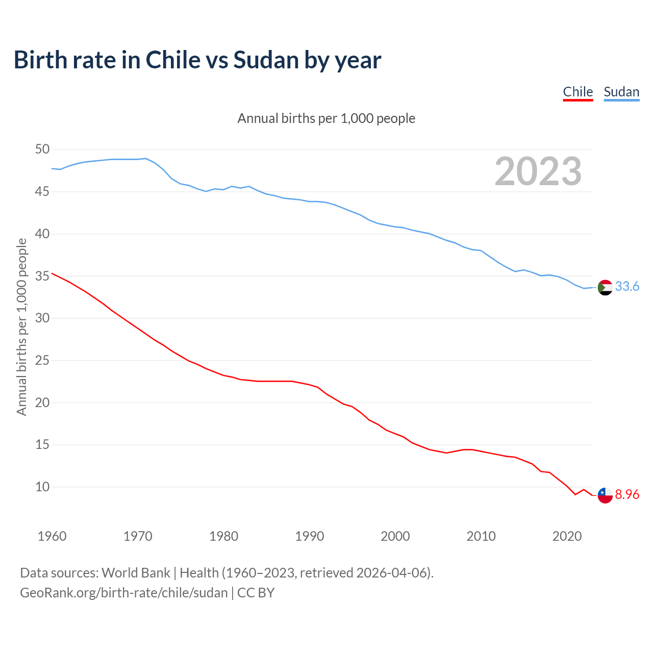 Chile has an annual birth rate of 8.96 births per 1,000 people, compared to 33.6 for Sudan. The average number of children a woman is expected to have during her lifetime — the fertility rate, is 1.17 in Chile and 4.32 in Sudan — 270.4% difference.