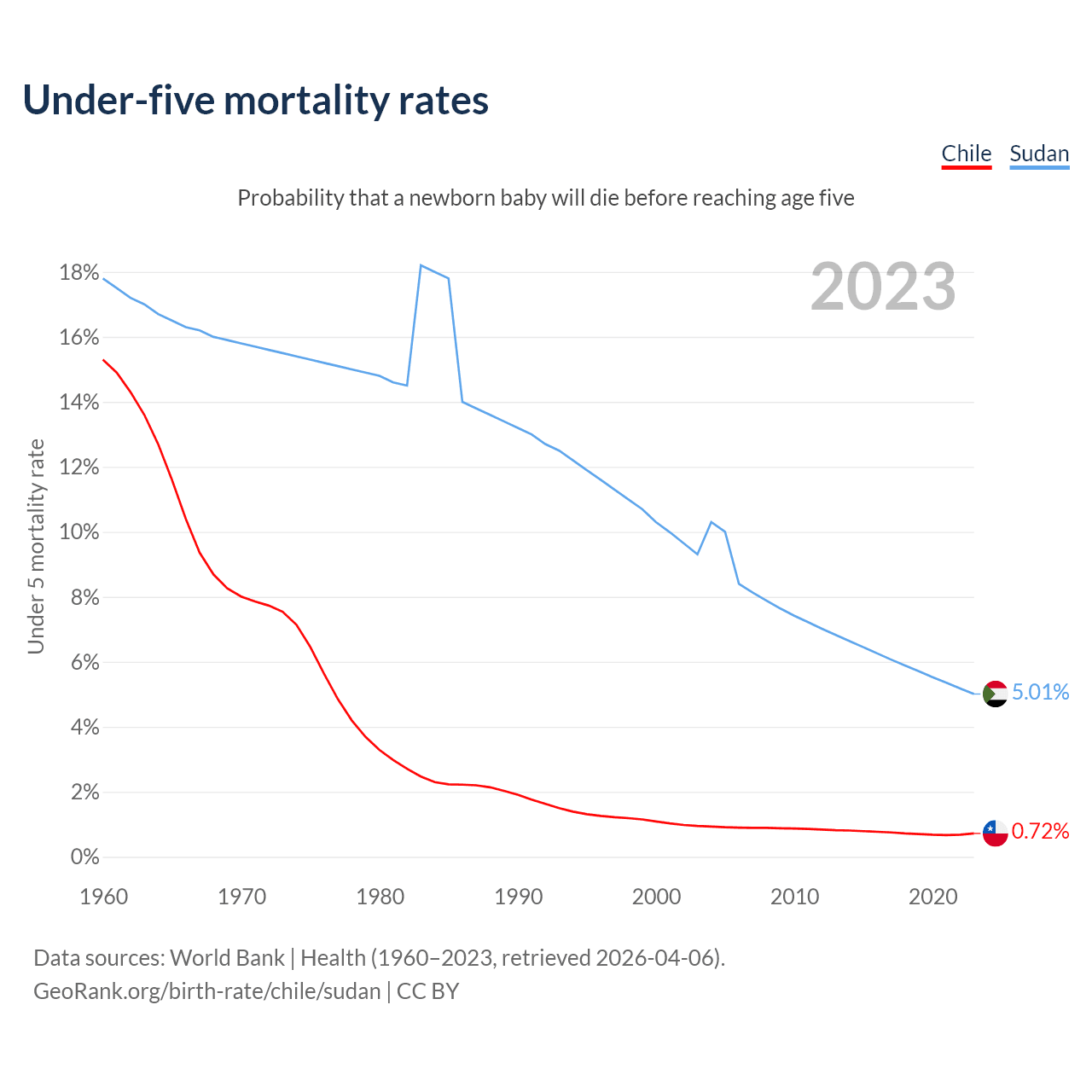 The chance that a newborn baby will die before reaching age five is 0.72% in Chile and 5.01% in Sudan. Above is a chart with historical data on under-five mortality rates.