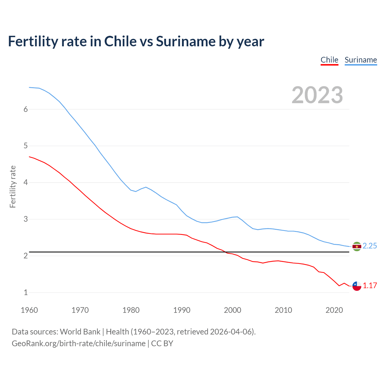 1960 vs 2023, the fertility rate has decreased by 75.2% in Chile and by 65.9% in Suriname — in 1960, it was 4.7 and 6.59, respectively.