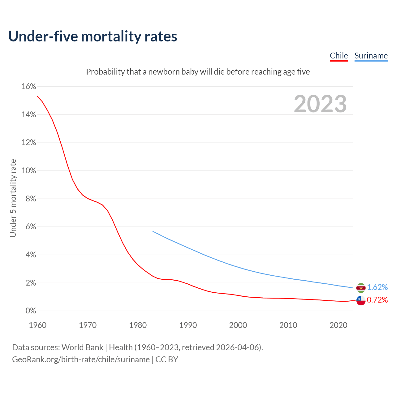 The chance that a newborn baby will die before reaching age five is 0.72% in Chile and 1.62% in Suriname. Above is a chart with historical data on under-five mortality rates.