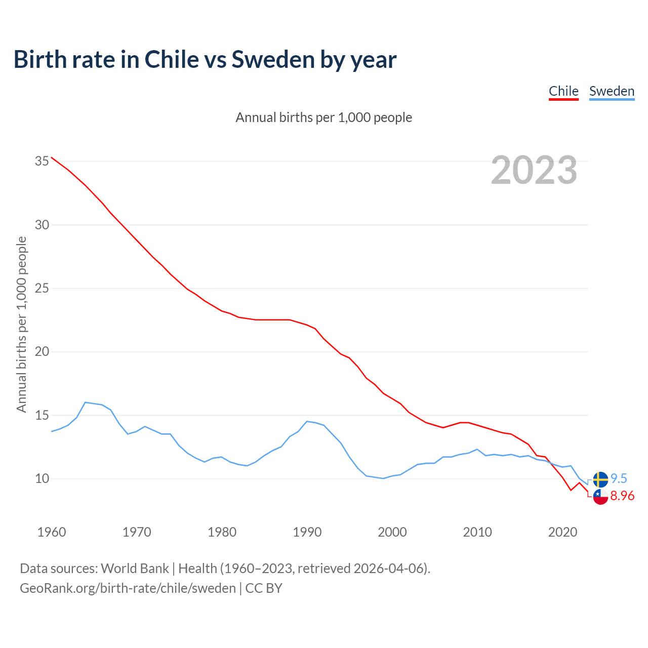 Chile has an annual birth rate of 8.96 births per 1,000 people, compared to 9.5 for Sweden. The average number of children a woman is expected to have during her lifetime — the fertility rate, is 1.17 in Chile and 1.45 in Sweden — 24.3% difference.