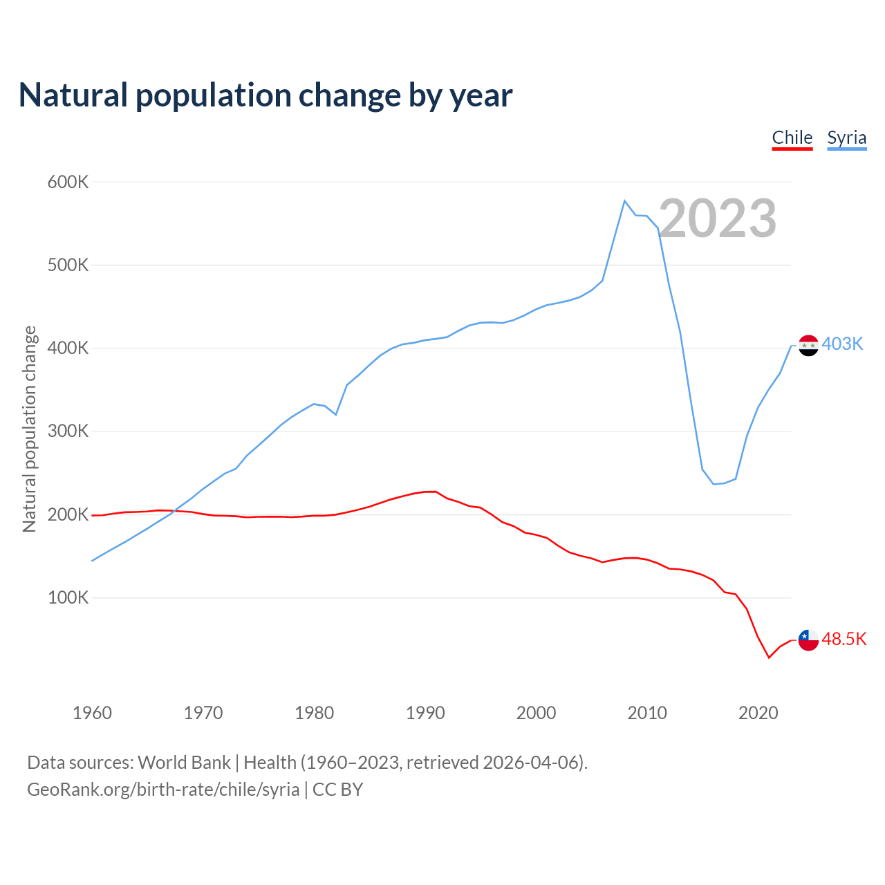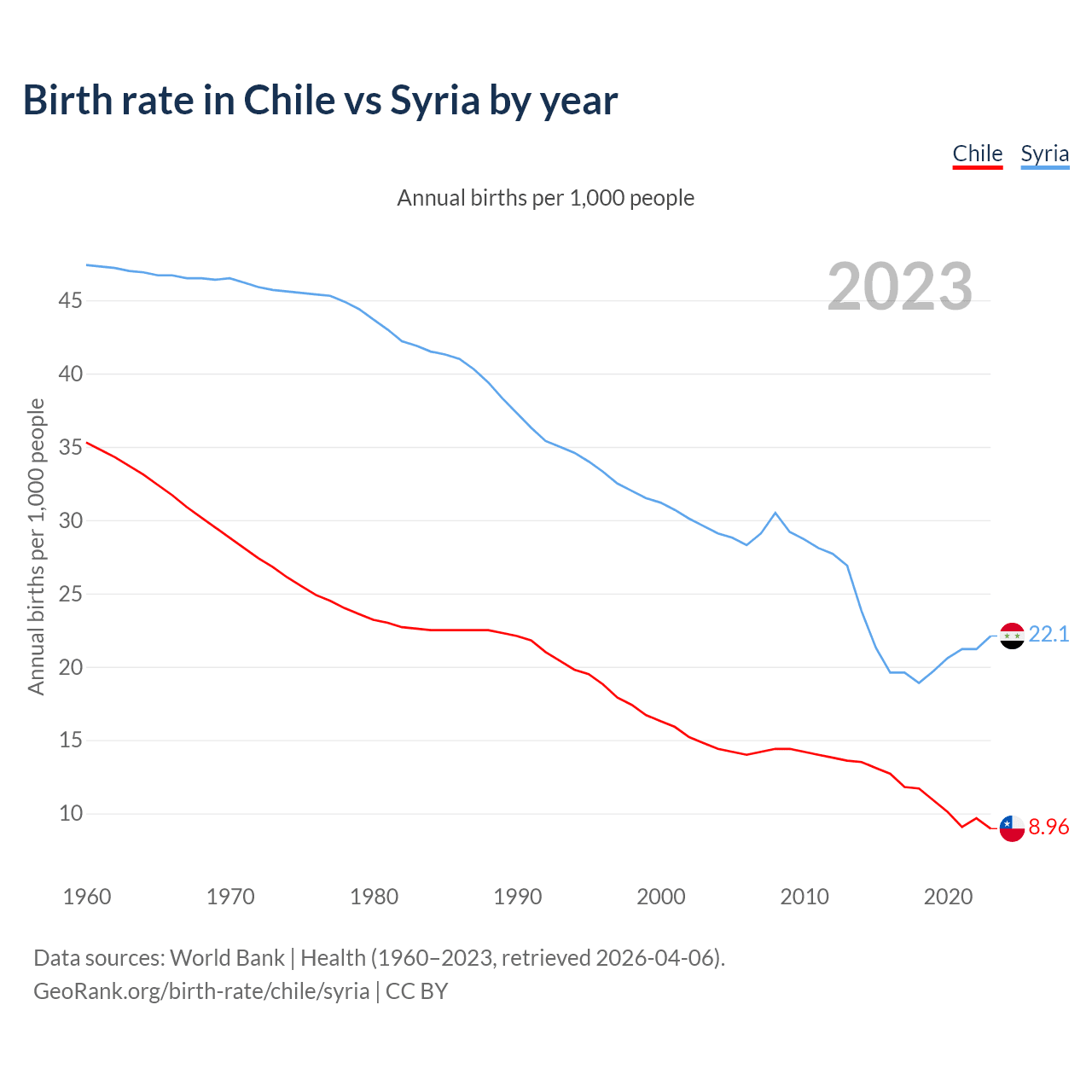Chile has an annual birth rate of 8.96 births per 1,000 people, compared to 22.1 for Syria. The average number of children a woman is expected to have during her lifetime — the fertility rate, is 1.17 in Chile and 2.71 in Syria — 132.4% difference.