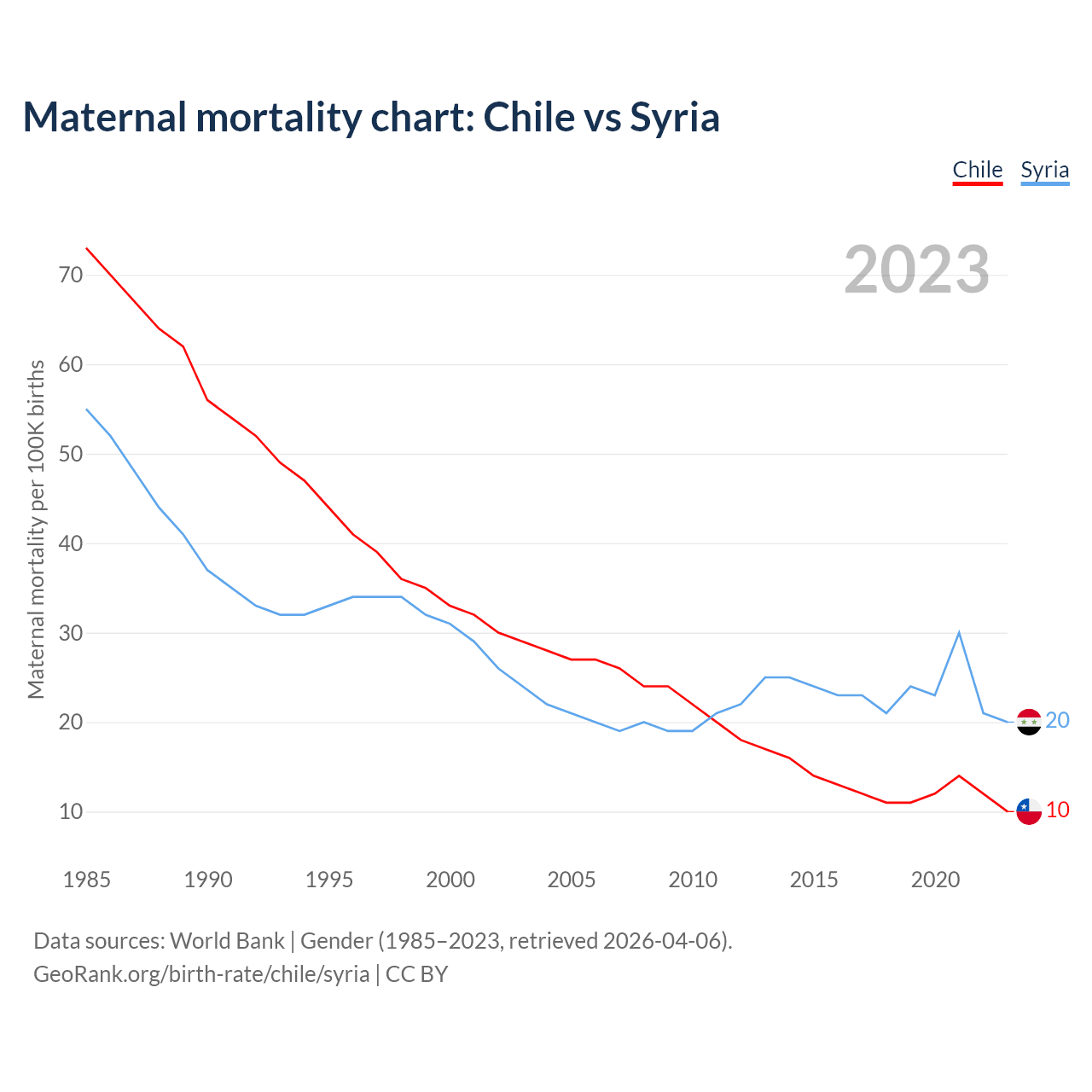 The maternal mortality rate, which is the probability of dying during childbirth or within 42 days of pregnancy termination, is 10 deaths per 100,000 live births in Chile, compared to 20 deaths in Syria.