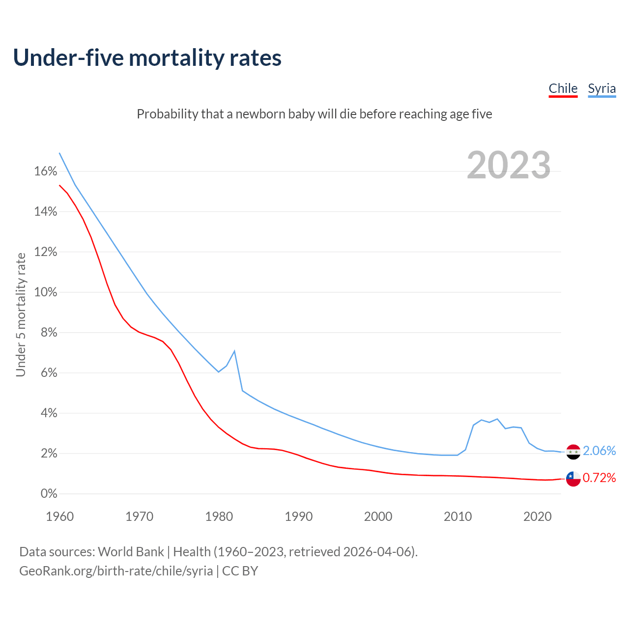 The chance that a newborn baby will die before reaching age five is 0.72% in Chile and 2.06% in Syria. Above is a chart with historical data on under-five mortality rates.