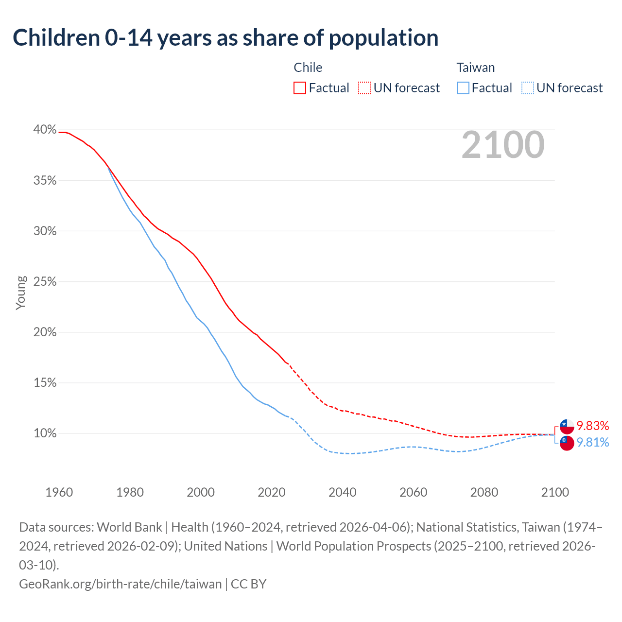 According to the latest available data on birth rates, the fertility rate in Chile was 1.17 children per woman in 2023, compared to 0.89 in Taiwan in 2024. The replacement level is considered to be 2.1 children per woman.