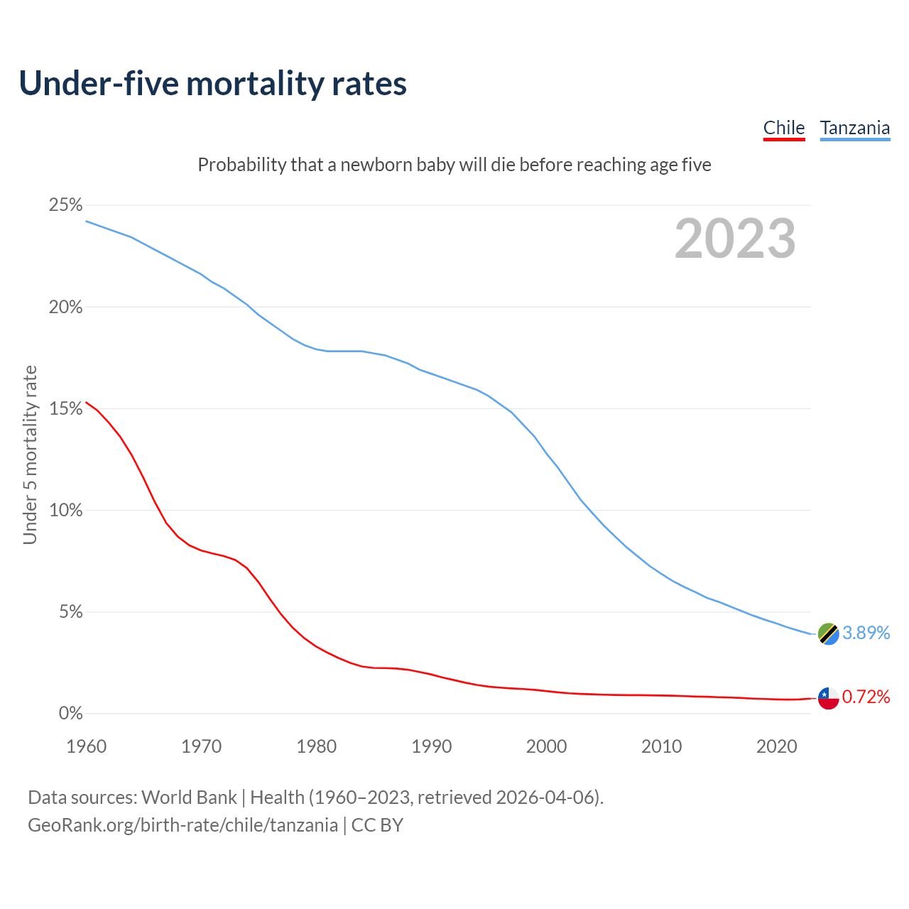 The chance that a newborn baby will die before reaching age five is 0.72% in Chile and 3.89% in Tanzania. Above is a chart with historical data on under-five mortality rates.