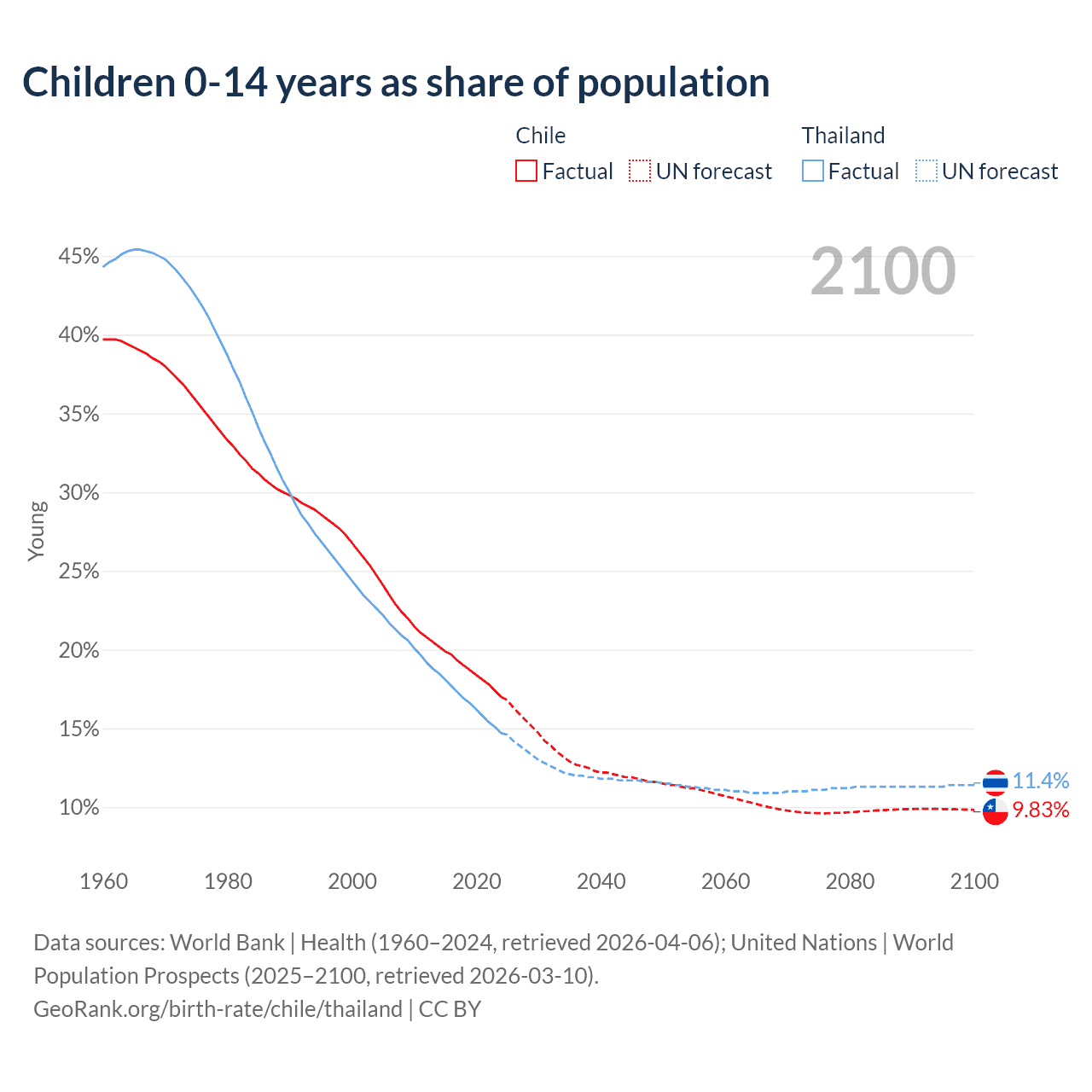 According to the latest available data on birth rates, the fertility rate in Chile was 1.17 children per woman in 2023, compared to 1.21 in Thailand in 2023. The replacement level is considered to be 2.1 children per woman.