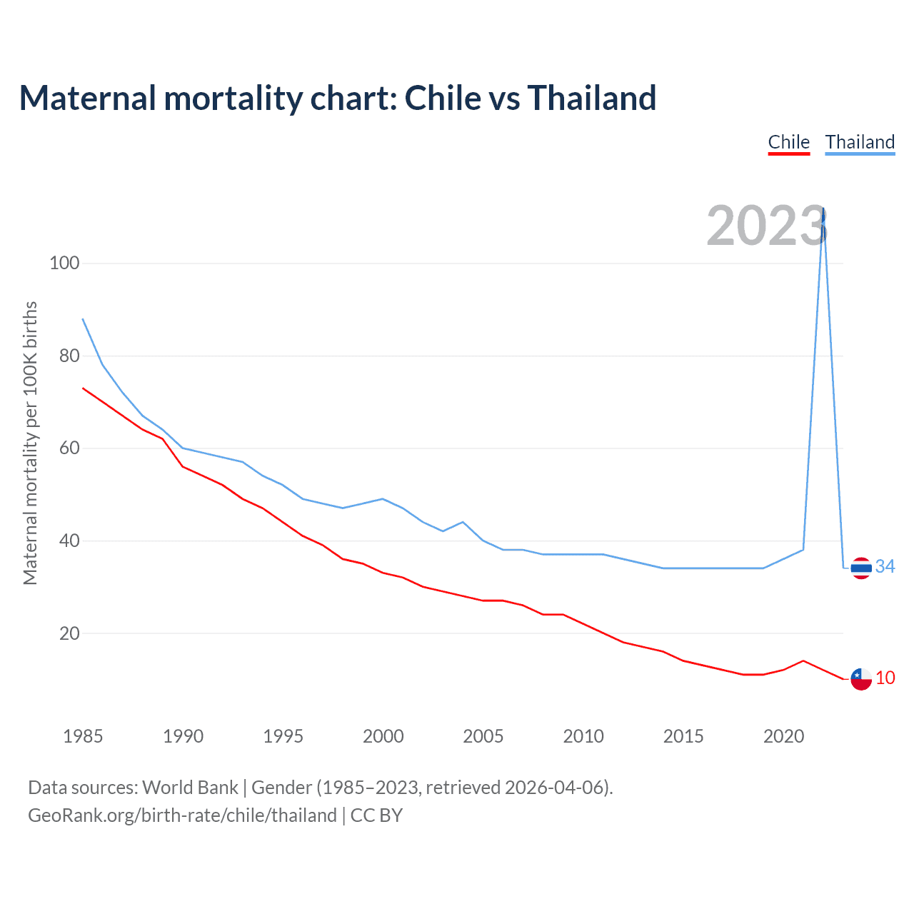 The maternal mortality rate, which is the probability of dying during childbirth or within 42 days of pregnancy termination, is 10 deaths per 100,000 live births in Chile, compared to 34 deaths in Thailand.