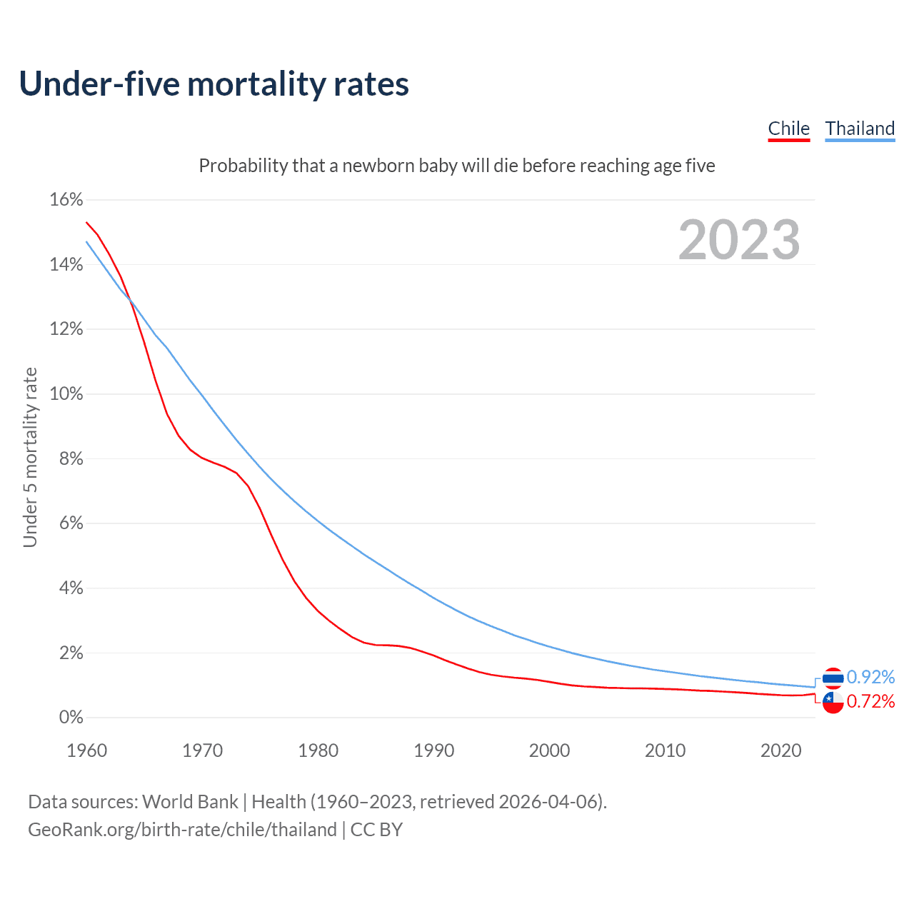 The chance that a newborn baby will die before reaching age five is 0.72% in Chile and 0.92% in Thailand. Above is a chart with historical data on under-five mortality rates.