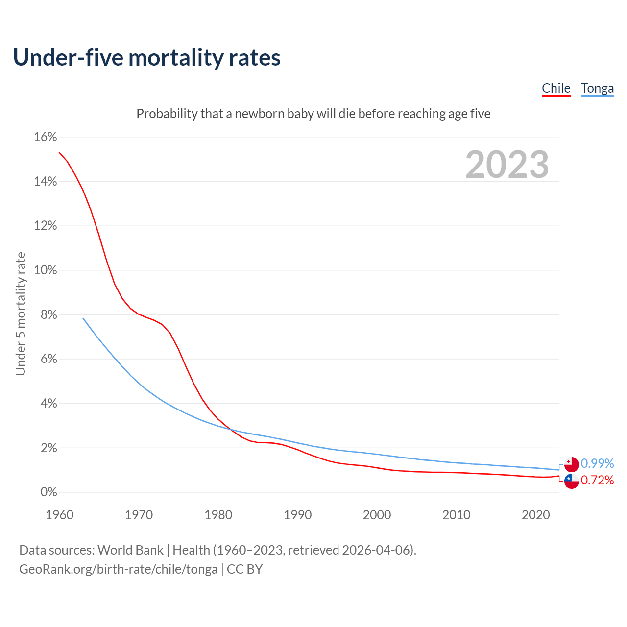 The chance that a newborn baby will die before reaching age five is 0.72% in Chile and 0.99% in Tonga. Above is a chart with historical data on under-five mortality rates.