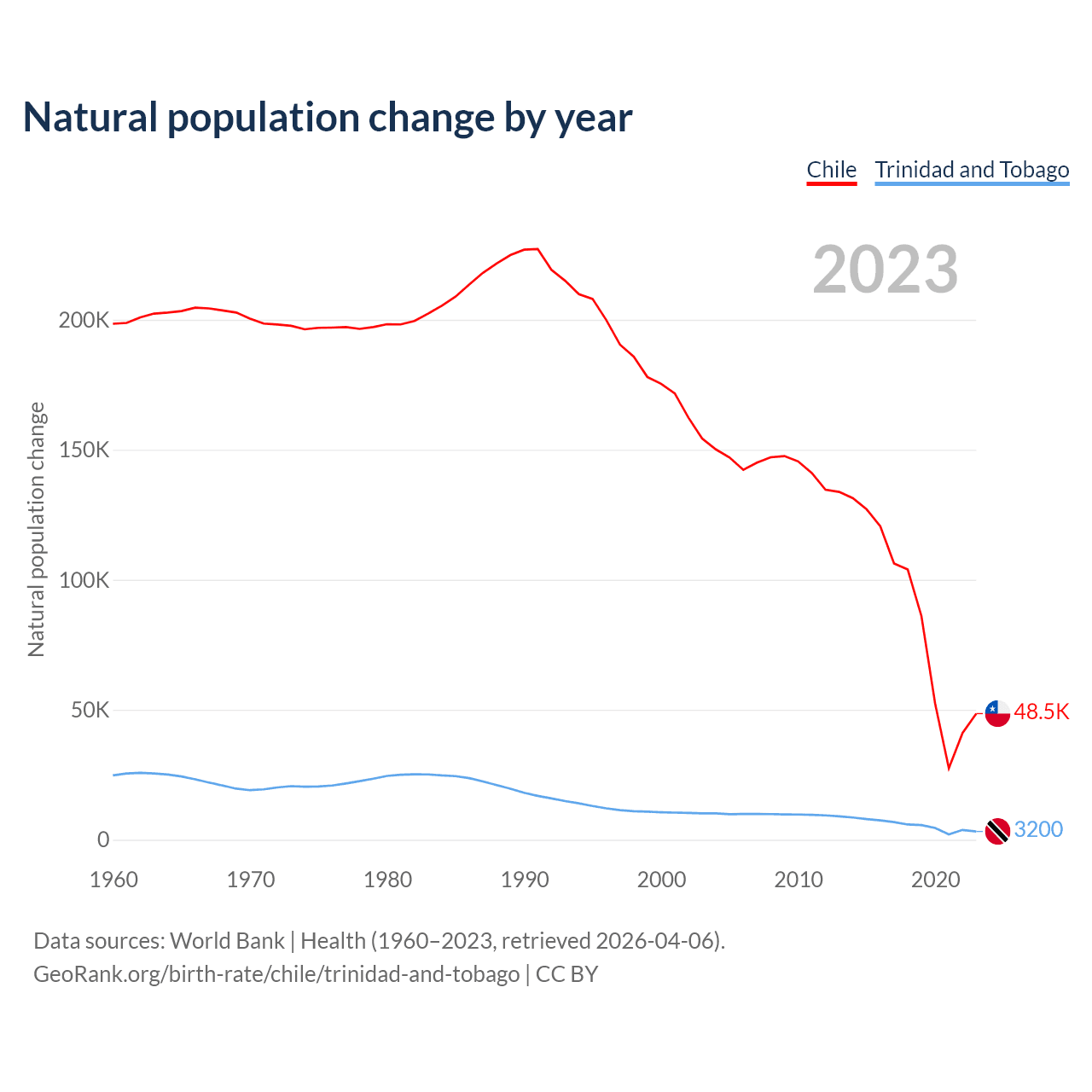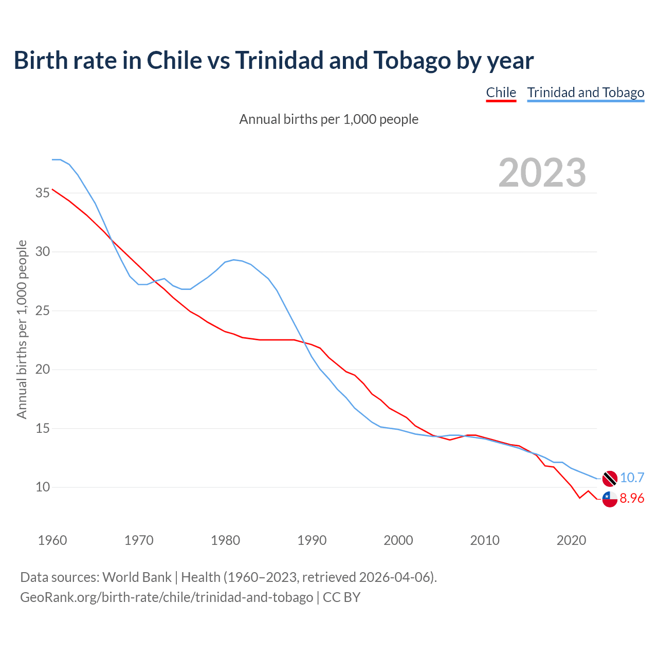 Chile has an annual birth rate of 8.96 births per 1,000 people, compared to 10.7 for Trinidad and Tobago. The average number of children a woman is expected to have during her lifetime — the fertility rate, is 1.17 in Chile and 1.53 in Trinidad and Tobago — 31.3% difference.