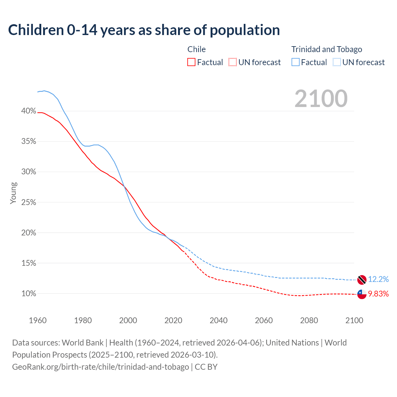 According to the latest available data on birth rates, the fertility rate in Chile was 1.17 children per woman in 2023, compared to 1.53 in Trinidad and Tobago in 2023. The replacement level is considered to be 2.1 children per woman.
