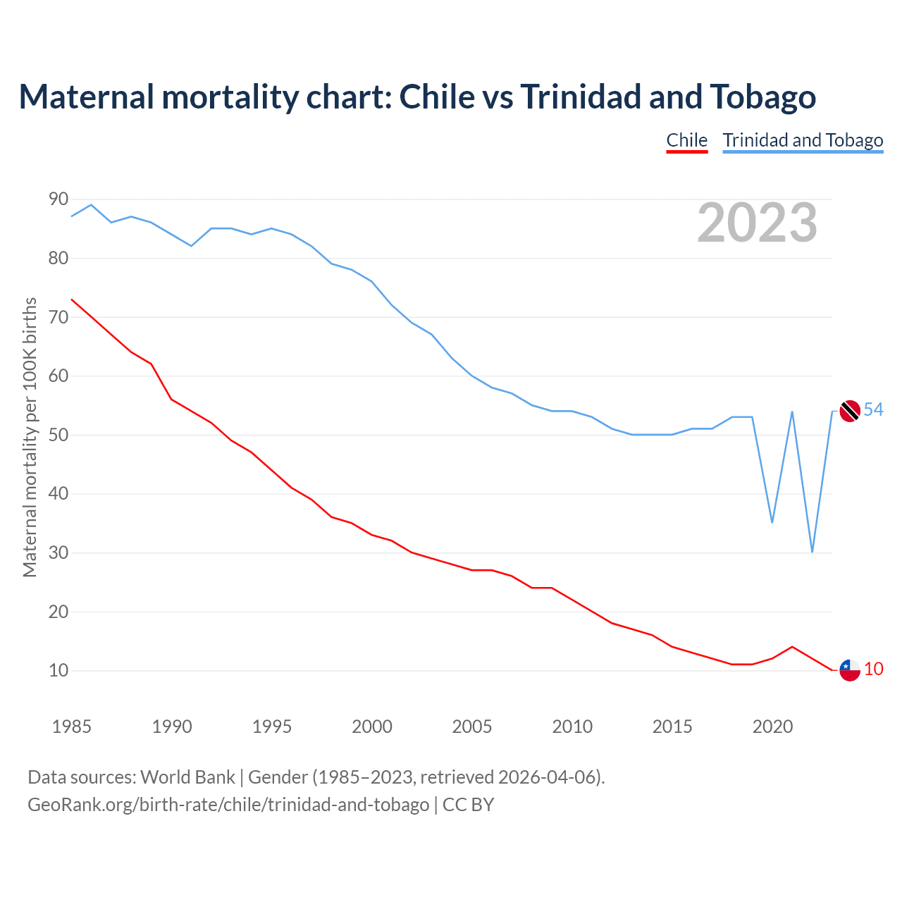 The maternal mortality rate, which is the probability of dying during childbirth or within 42 days of pregnancy termination, is 10 deaths per 100,000 live births in Chile, compared to 54 deaths in Trinidad and Tobago.