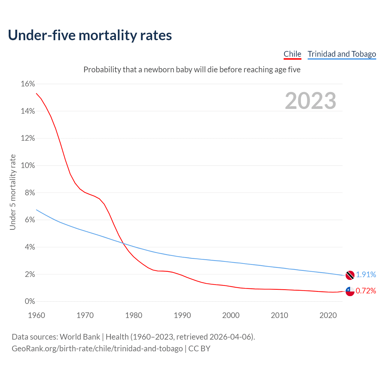 The chance that a newborn baby will die before reaching age five is 0.72% in Chile and 1.91% in Trinidad and Tobago. Above is a chart with historical data on under-five mortality rates.