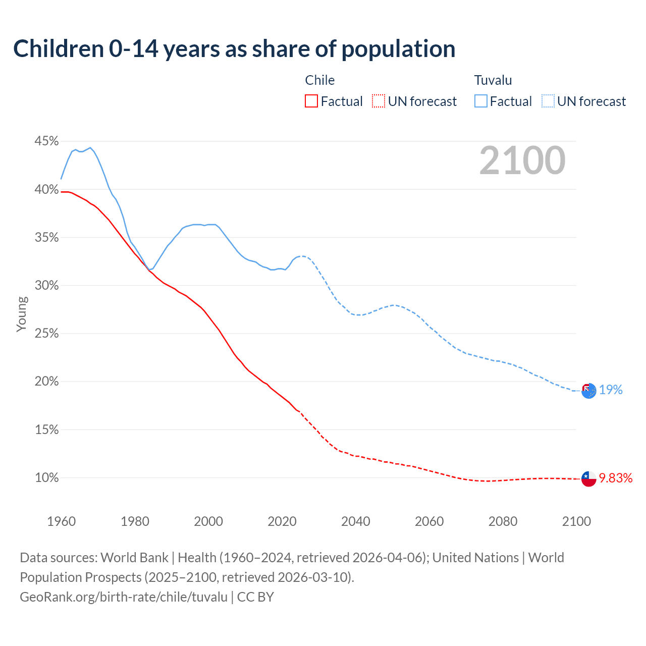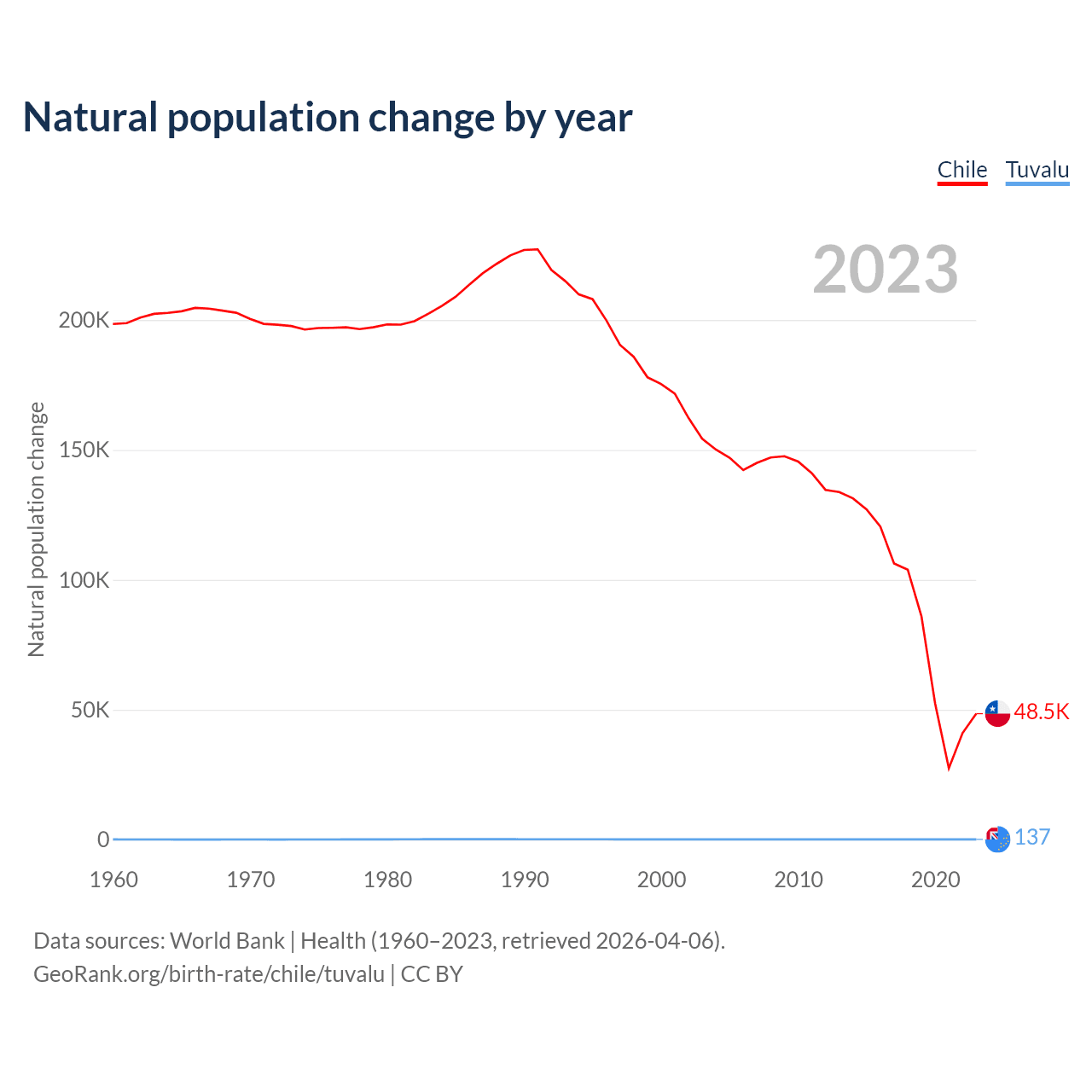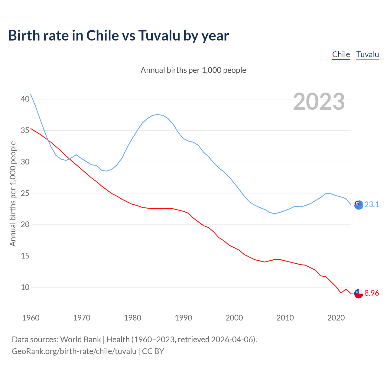 Chile has an annual birth rate of 8.96 births per 1,000 people, compared to 23.1 for Tuvalu. The average number of children a woman is expected to have during her lifetime — the fertility rate, is 1.17 in Chile and 3.21 in Tuvalu — 174.9% difference.