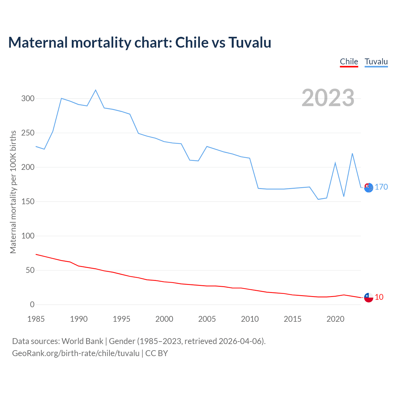 The maternal mortality rate, which is the probability of dying during childbirth or within 42 days of pregnancy termination, is 10 deaths per 100,000 live births in Chile, compared to 170 deaths in Tuvalu.