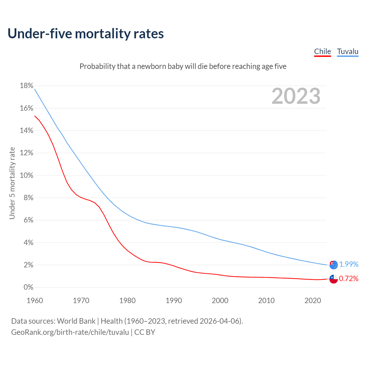 The chance that a newborn baby will die before reaching age five is 0.72% in Chile and 1.99% in Tuvalu. Above is a chart with historical data on under-five mortality rates.
