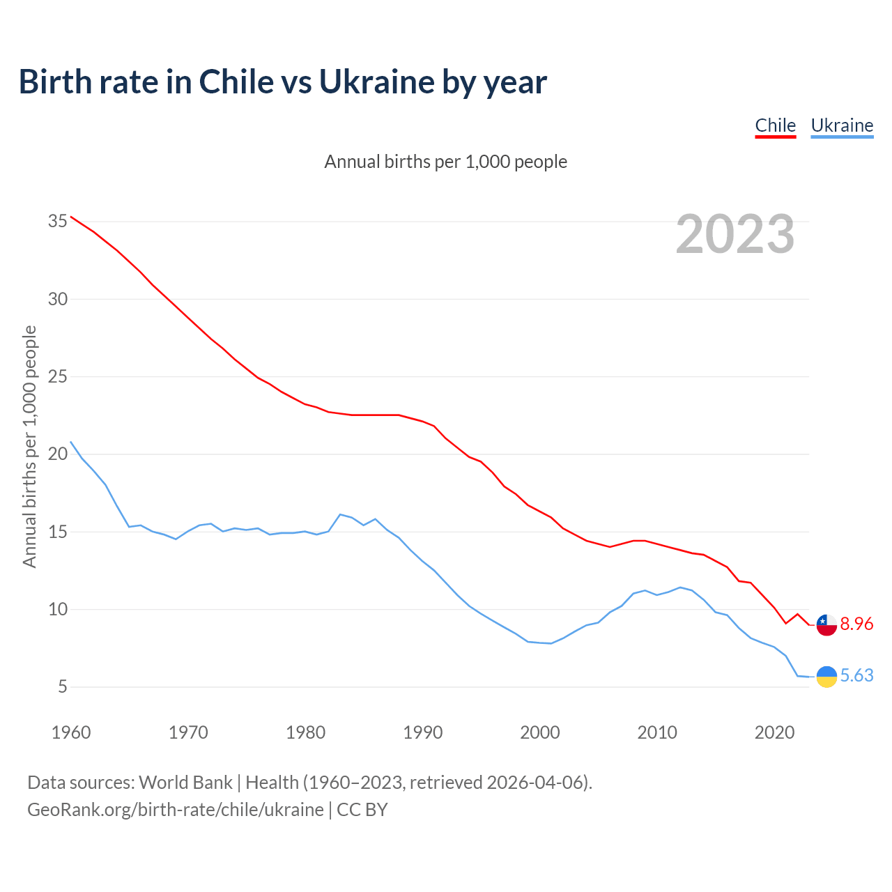 Chile has an annual birth rate of 8.96 births per 1,000 people, compared to 5.63 for Ukraine. The average number of children a woman is expected to have during her lifetime — the fertility rate, is 1.17 in Chile and 0.98 in Ukraine — 16.3% difference.