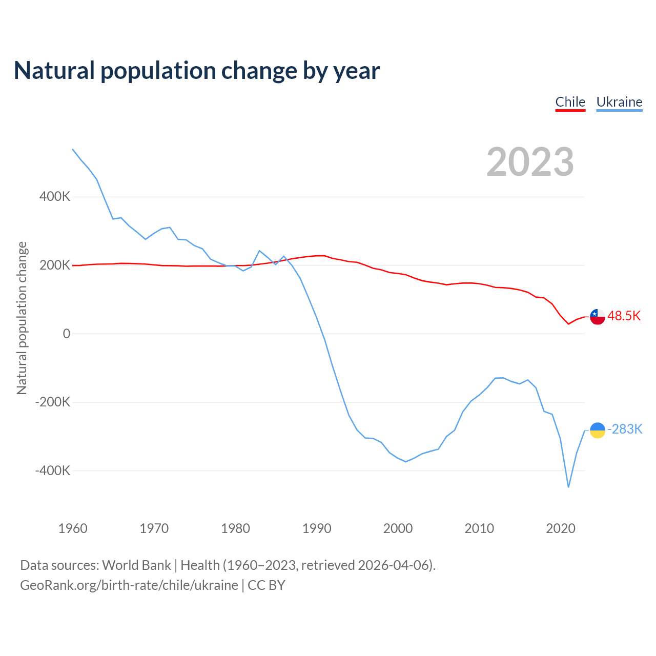 According to the latest available data on birth rates, the fertility rate in Chile was 1.17 children per woman in 2023, compared to 0.98 in Ukraine in 2023. The replacement level is considered to be 2.1 children per woman.