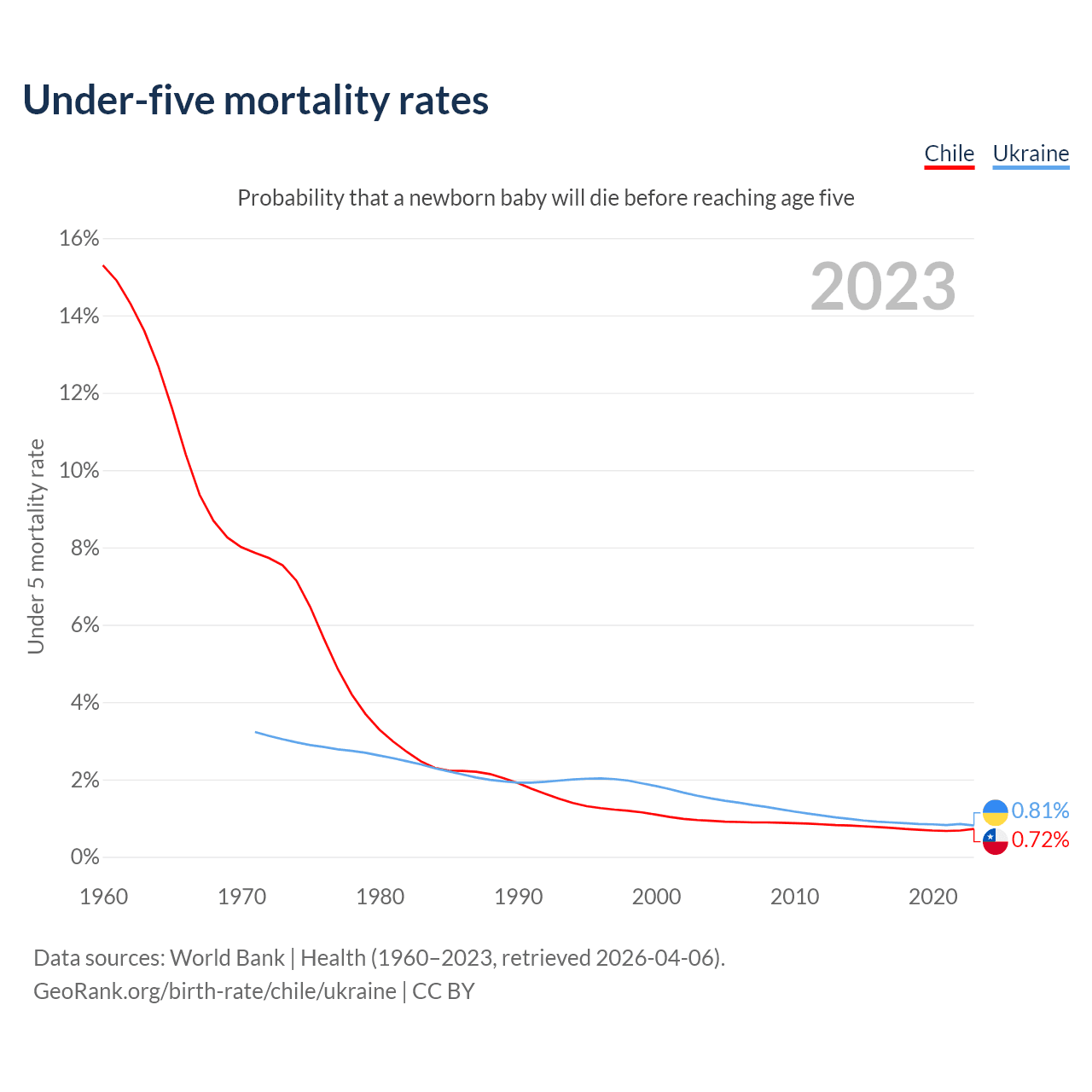 The chance that a newborn baby will die before reaching age five is 0.72% in Chile and 0.81% in Ukraine. Above is a chart with historical data on under-five mortality rates.
