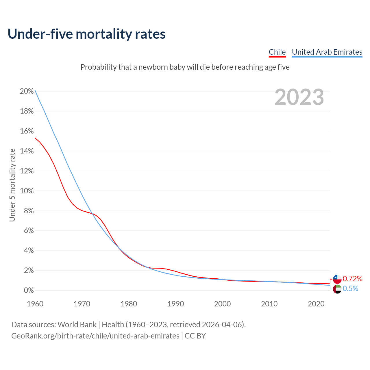 The chance that a newborn baby will die before reaching age five is 0.72% in Chile and 0.5% in the United Arab Emirates. Above is a chart with historical data on under-five mortality rates.