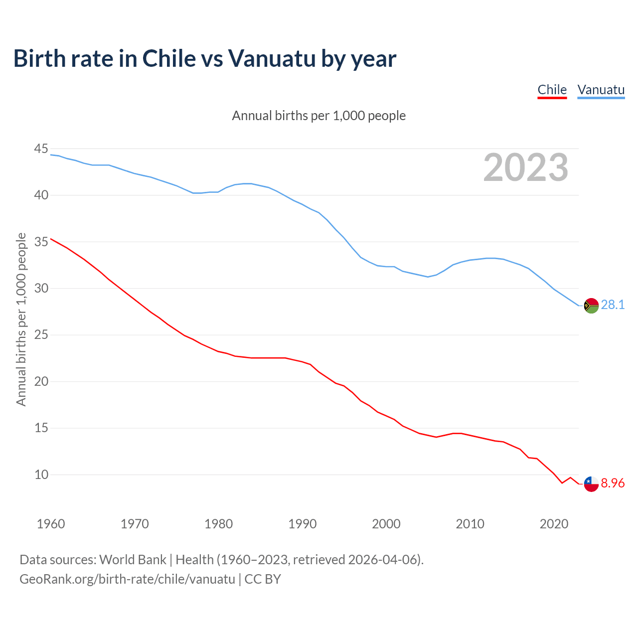 Chile has an annual birth rate of 8.96 births per 1,000 people, compared to 28.1 for Vanuatu. The average number of children a woman is expected to have during her lifetime — the fertility rate, is 1.17 in Chile and 3.6 in Vanuatu — 208.1% difference.