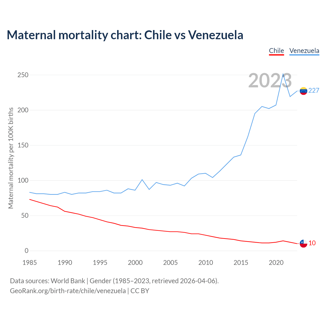 The maternal mortality rate, which is the probability of dying during childbirth or within 42 days of pregnancy termination, is 10 deaths per 100,000 live births in Chile, compared to 227 deaths in Venezuela.