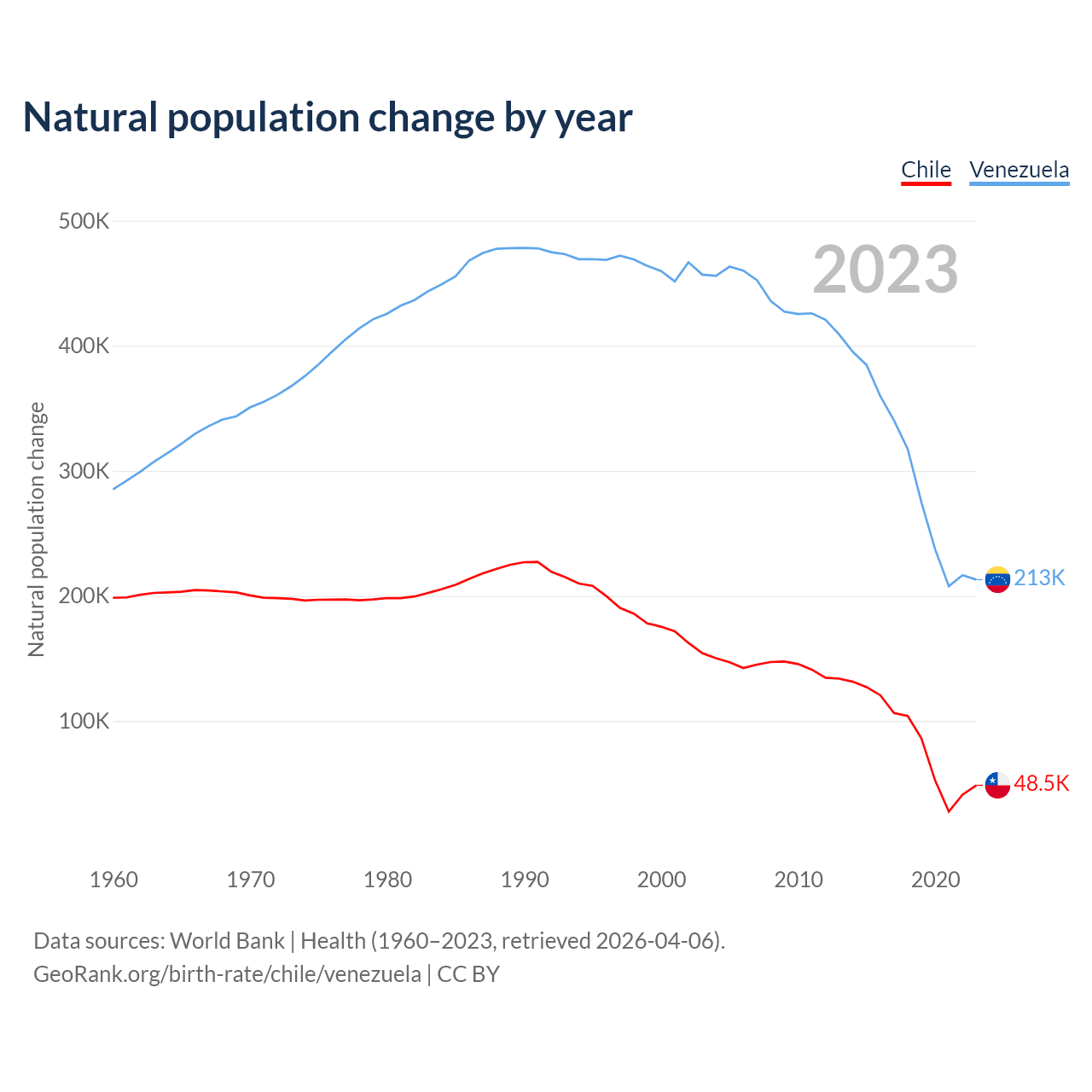 According to the latest available data on birth rates, the fertility rate in Chile was 1.17 children per woman in 2023, compared to 2.08 in Venezuela in 2023. The replacement level is considered to be 2.1 children per woman.