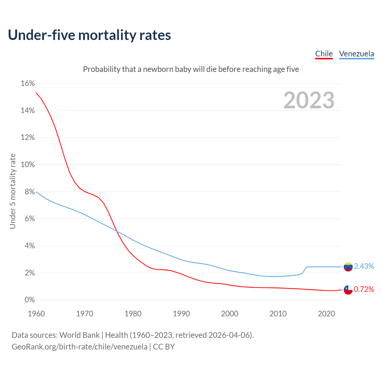 The chance that a newborn baby will die before reaching age five is 0.72% in Chile and 2.43% in Venezuela. Above is a chart with historical data on under-five mortality rates.