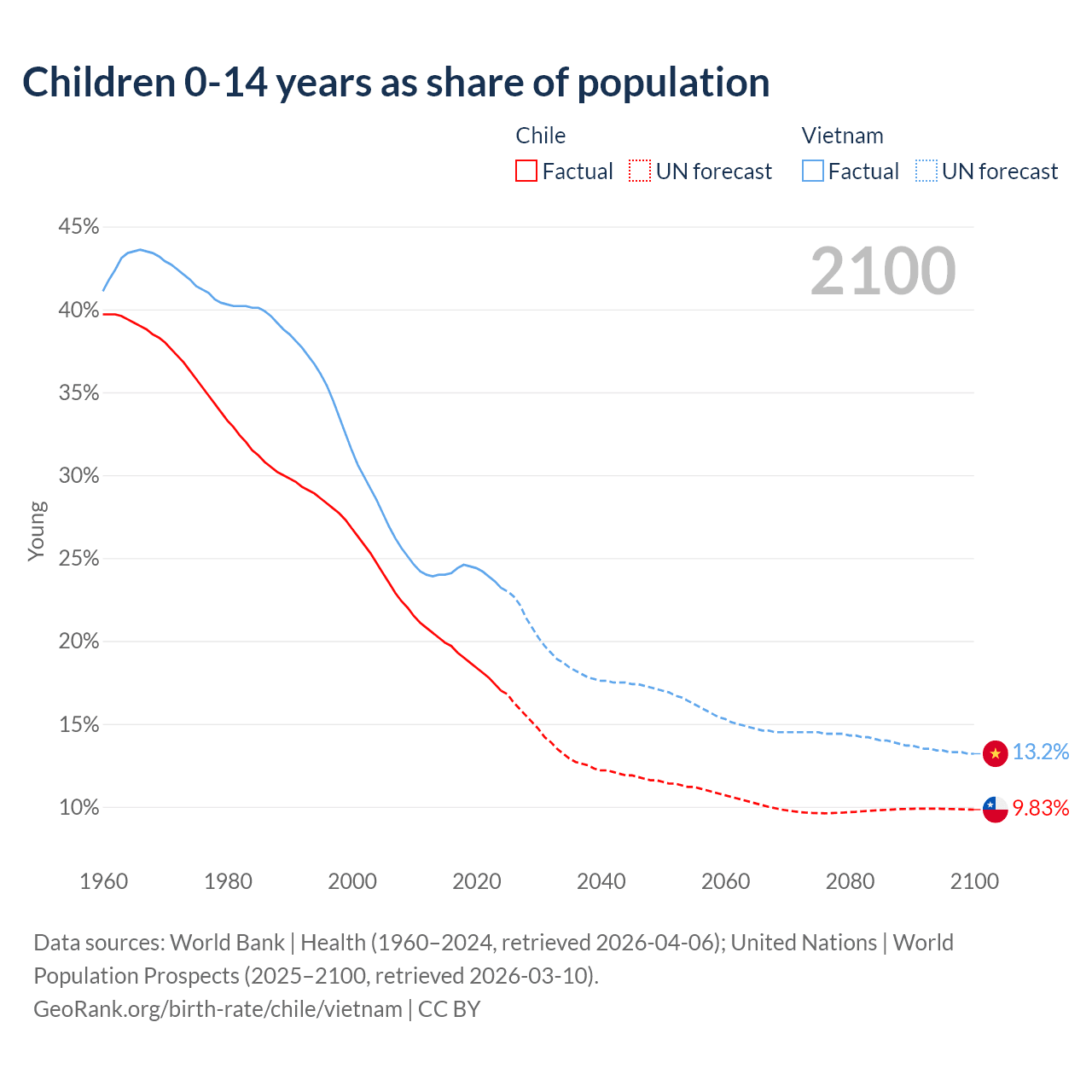 According to the latest available data on birth rates, the fertility rate in Chile was 1.17 children per woman in 2023, compared to 1.91 in Vietnam in 2023. The replacement level is considered to be 2.1 children per woman.