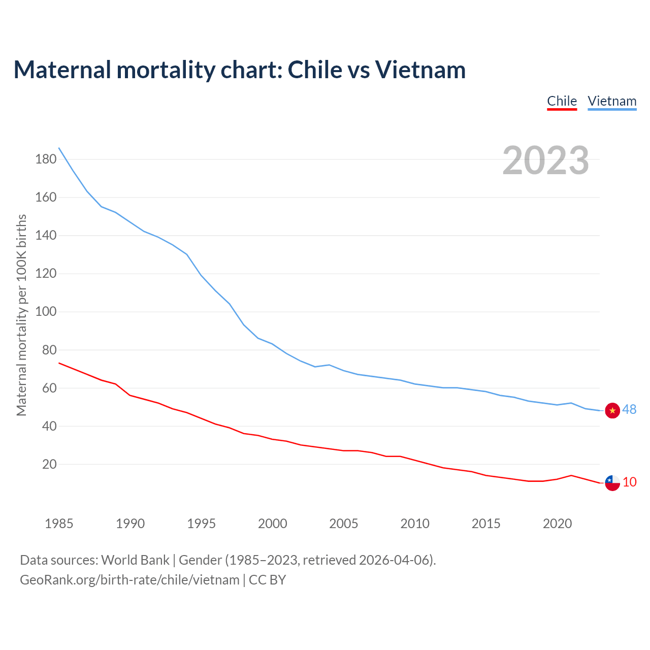 The maternal mortality rate, which is the probability of dying during childbirth or within 42 days of pregnancy termination, is 10 deaths per 100,000 live births in Chile, compared to 48 deaths in Vietnam.
