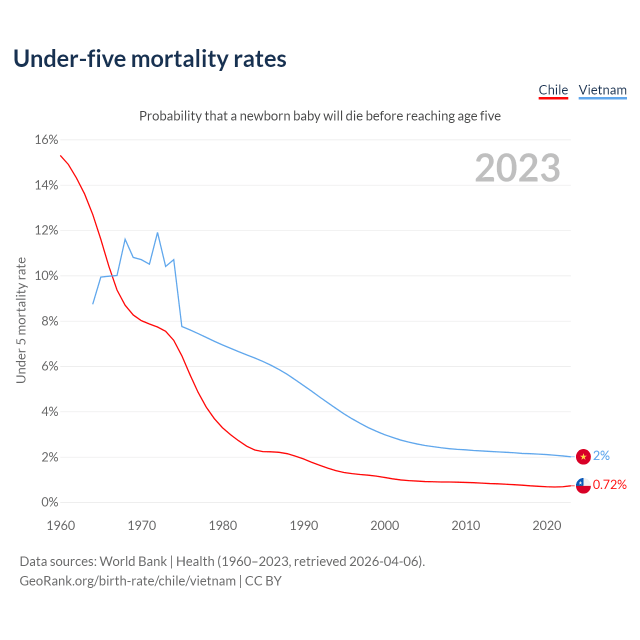 The chance that a newborn baby will die before reaching age five is 0.72% in Chile and 2% in Vietnam. Above is a chart with historical data on under-five mortality rates.