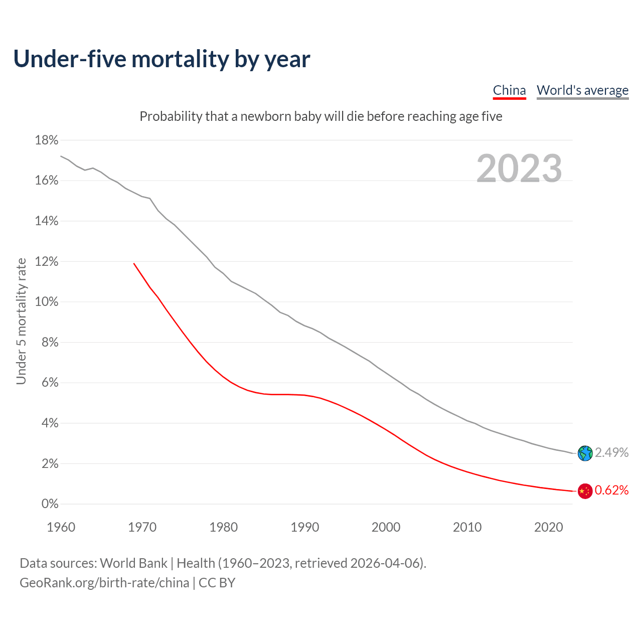 The under-5 mortality rate in China was 6.2 deaths per 1,000 live births in 2023 — a 0.62% chance that a newborn baby will die before reaching age five. This is down from 36.7 deaths per 1,000 live births in 2000.