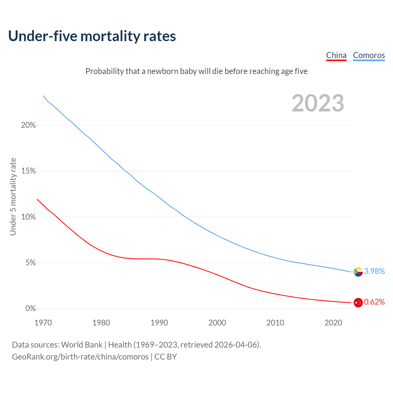 The chance that a newborn baby will die before reaching age five is 0.62% in China and 3.98% in Comoros. Above is a chart with historical data on under-five mortality rates.