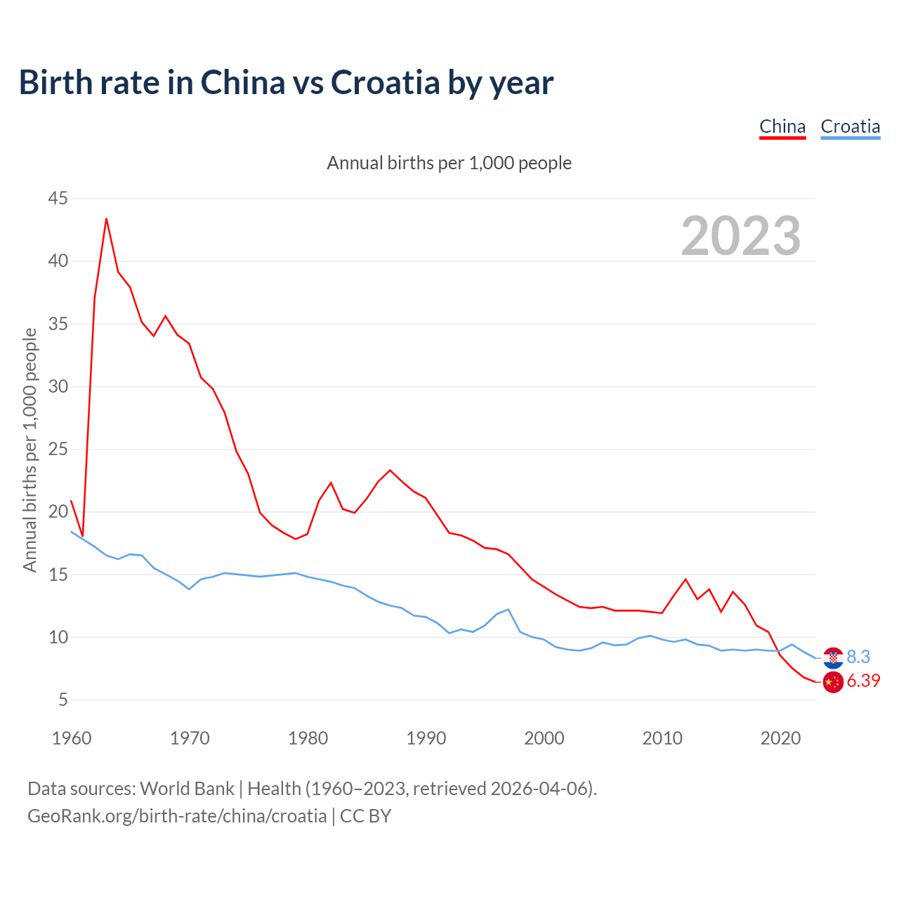 According to the latest available data on birth rates, the fertility rate in China was 1 children per woman in 2023, compared to 1.46 in Croatia in 2023. The replacement level is considered to be 2.1 children per woman.