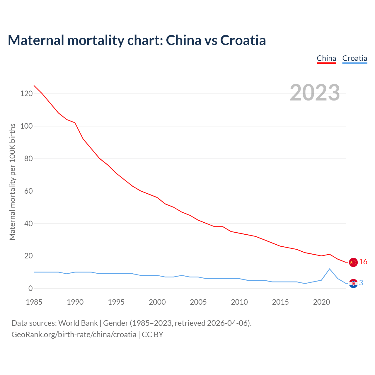 The maternal mortality rate, which is the probability of dying during childbirth or within 42 days of pregnancy termination, is 16 deaths per 100,000 live births in China, compared to 3 deaths in Croatia.