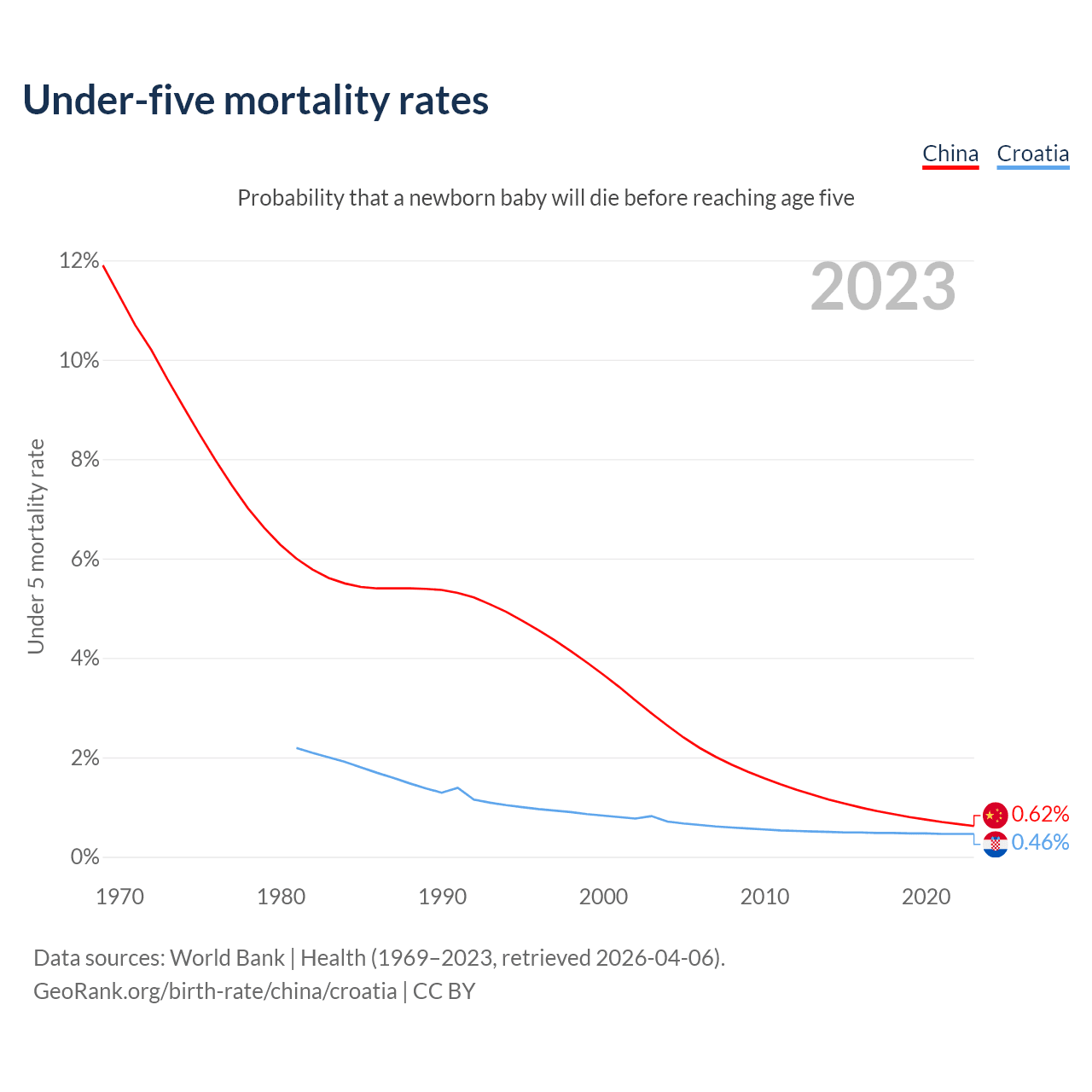 The chance that a newborn baby will die before reaching age five is 0.62% in China and 0.46% in Croatia. Above is a chart with historical data on under-five mortality rates.
