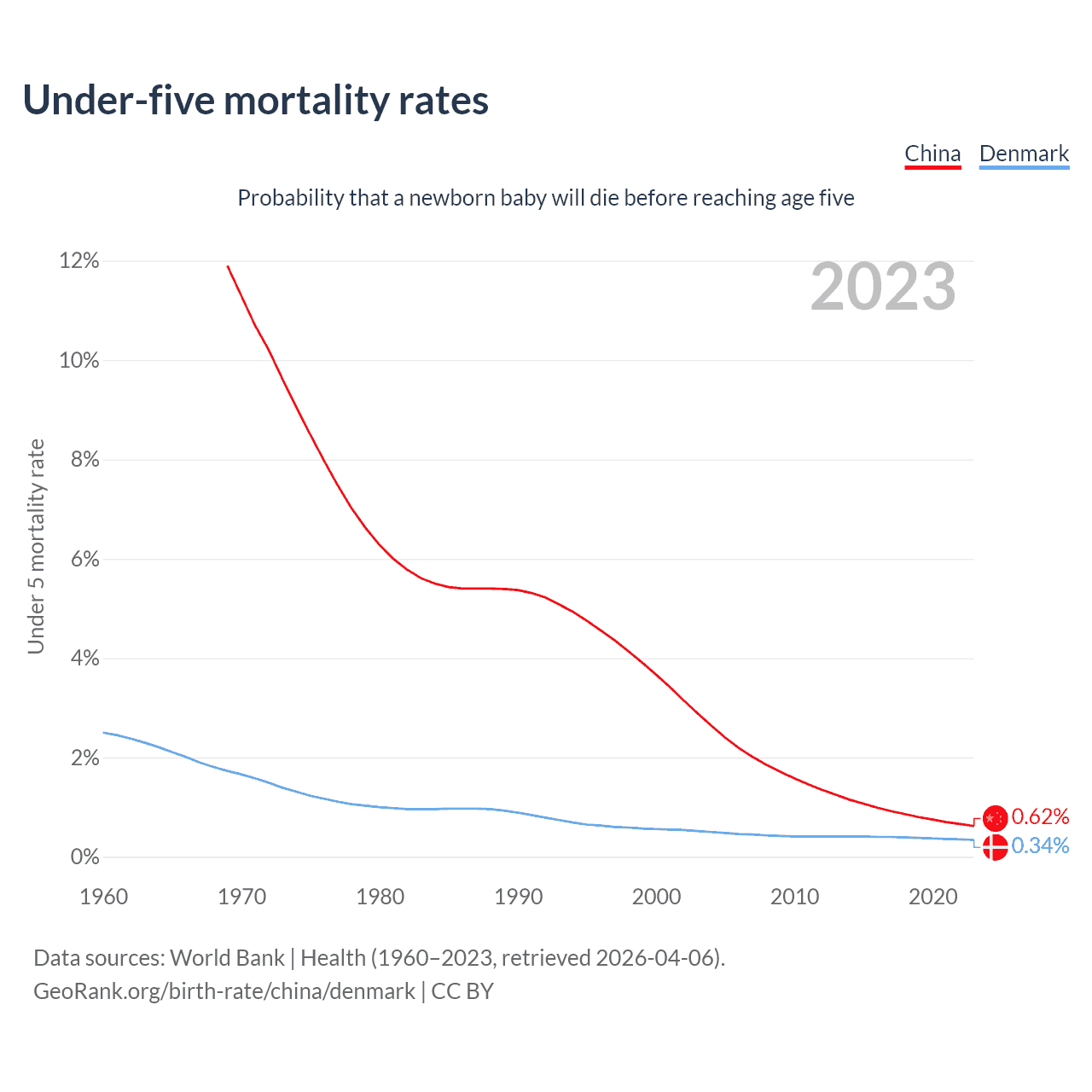The chance that a newborn baby will die before reaching age five is 0.62% in China and 0.34% in Denmark. Above is a chart with historical data on under-five mortality rates.