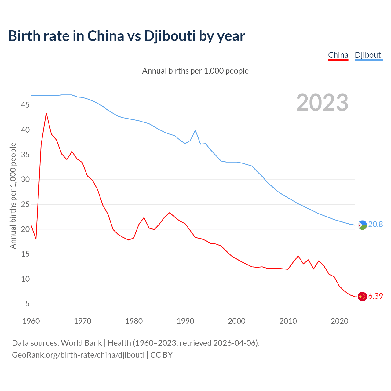 China has an annual birth rate of 6.39 births per 1,000 people, compared to 20.8 for Djibouti. The average number of children a woman is expected to have during her lifetime — the fertility rate, is 1 in China and 2.61 in Djibouti — 161.2% difference.