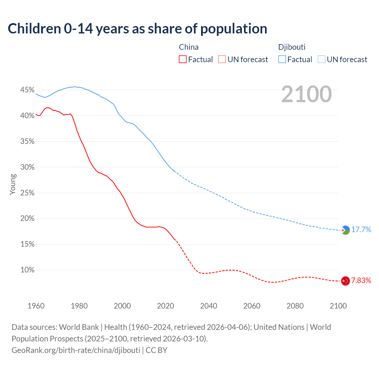 According to the latest available data on birth rates, the fertility rate in China was 1 children per woman in 2023, compared to 2.61 in Djibouti in 2023. The replacement level is considered to be 2.1 children per woman.