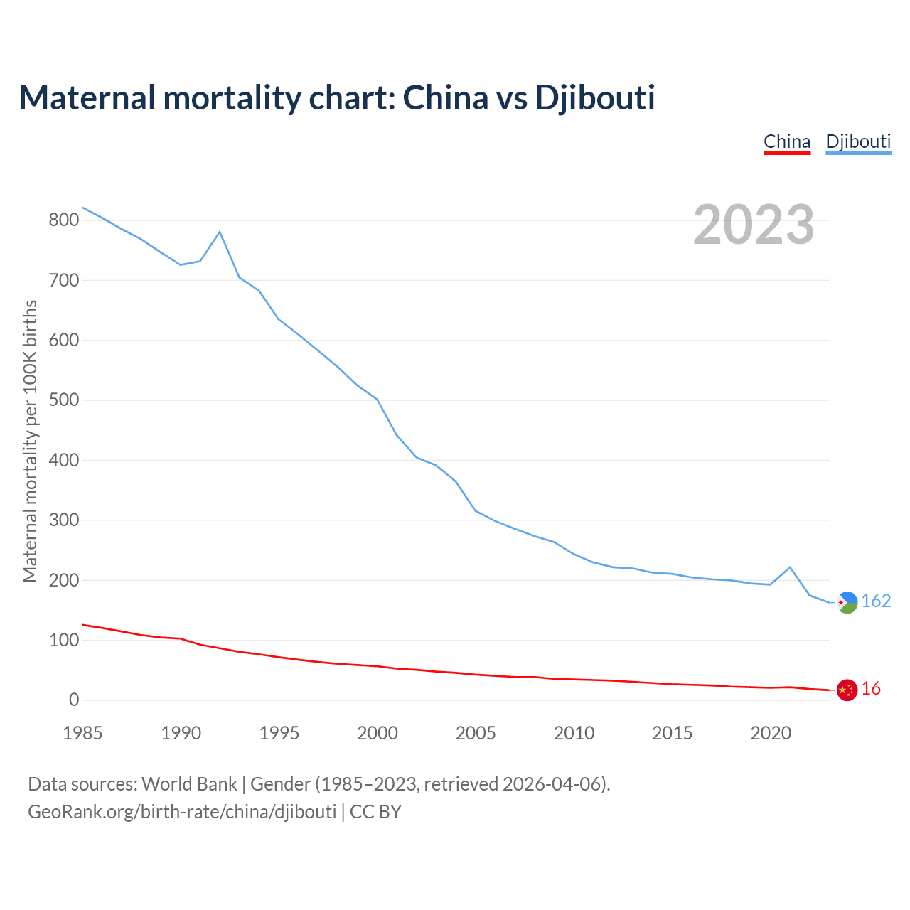 The maternal mortality rate, which is the probability of dying during childbirth or within 42 days of pregnancy termination, is 16 deaths per 100,000 live births in China, compared to 162 deaths in Djibouti.