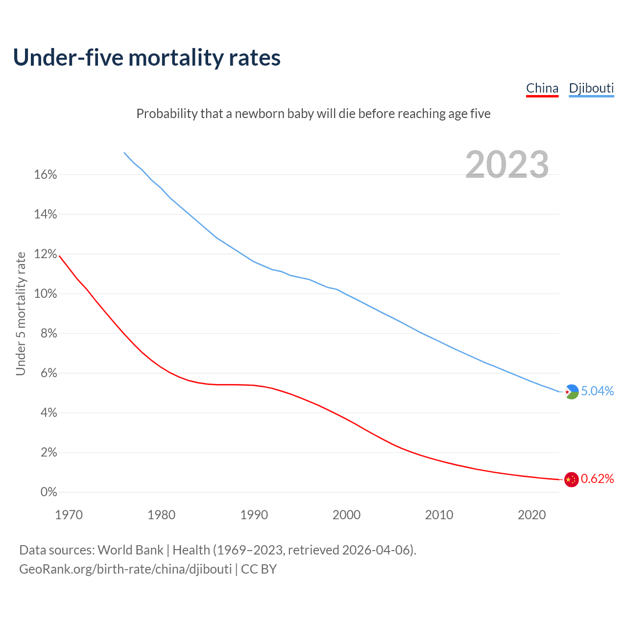 The chance that a newborn baby will die before reaching age five is 0.62% in China and 5.04% in Djibouti. Above is a chart with historical data on under-five mortality rates.