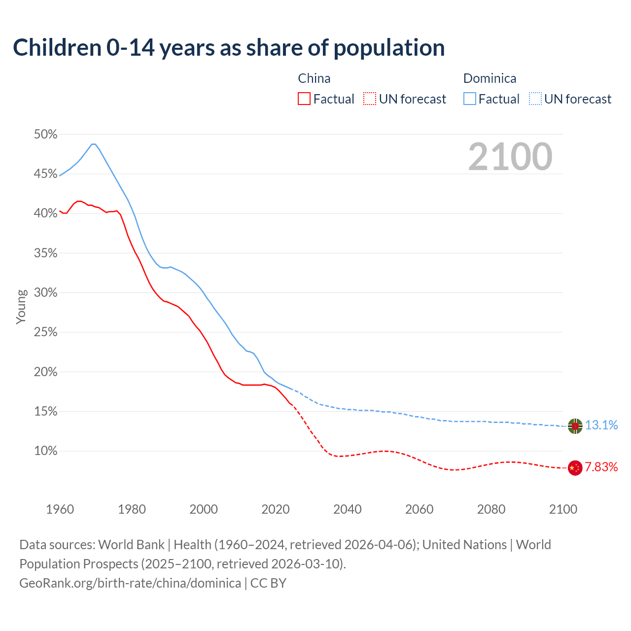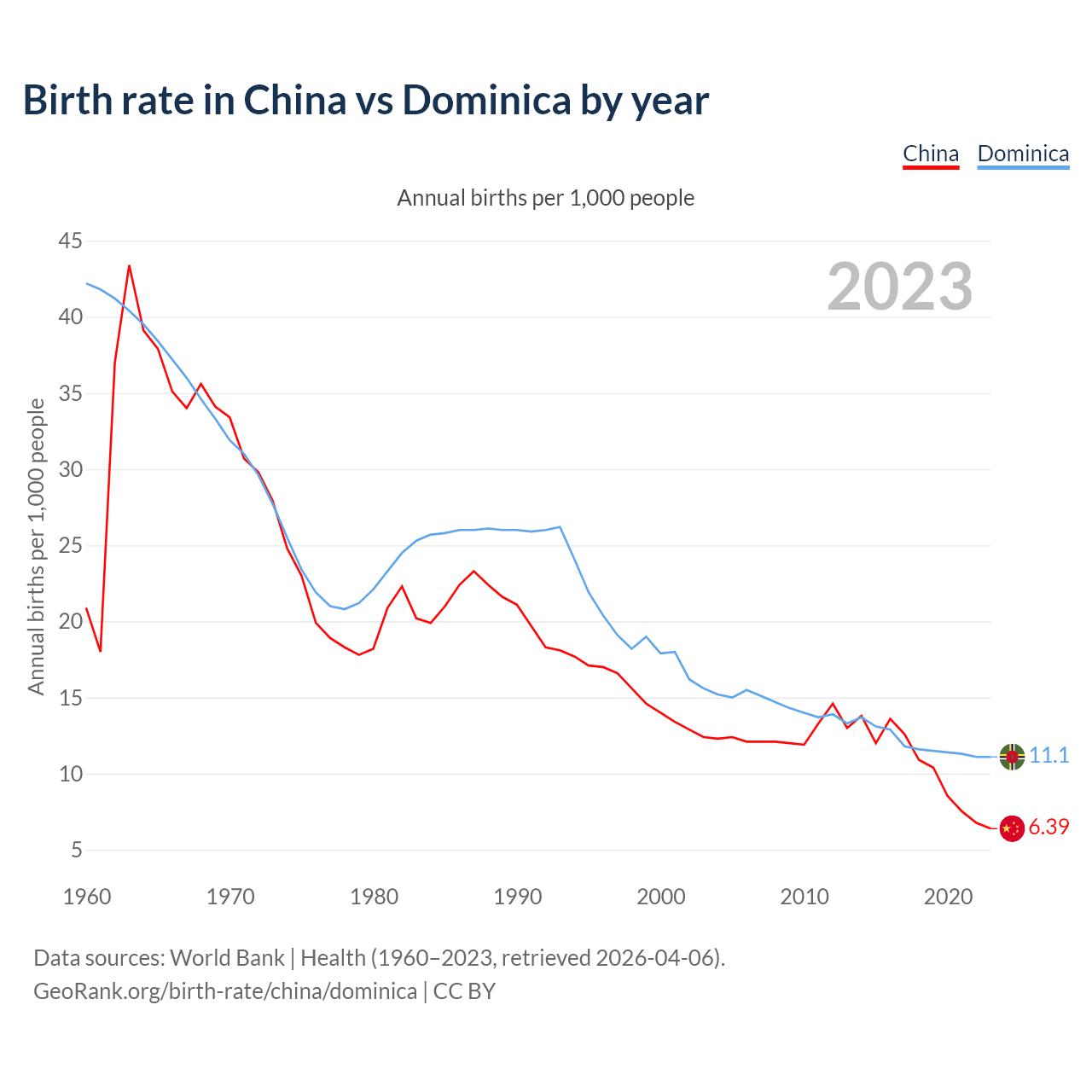 According to the latest available data on birth rates, the fertility rate in China was 1 children per woman in 2023, compared to 1.48 in Dominica in 2023. The replacement level is considered to be 2.1 children per woman.