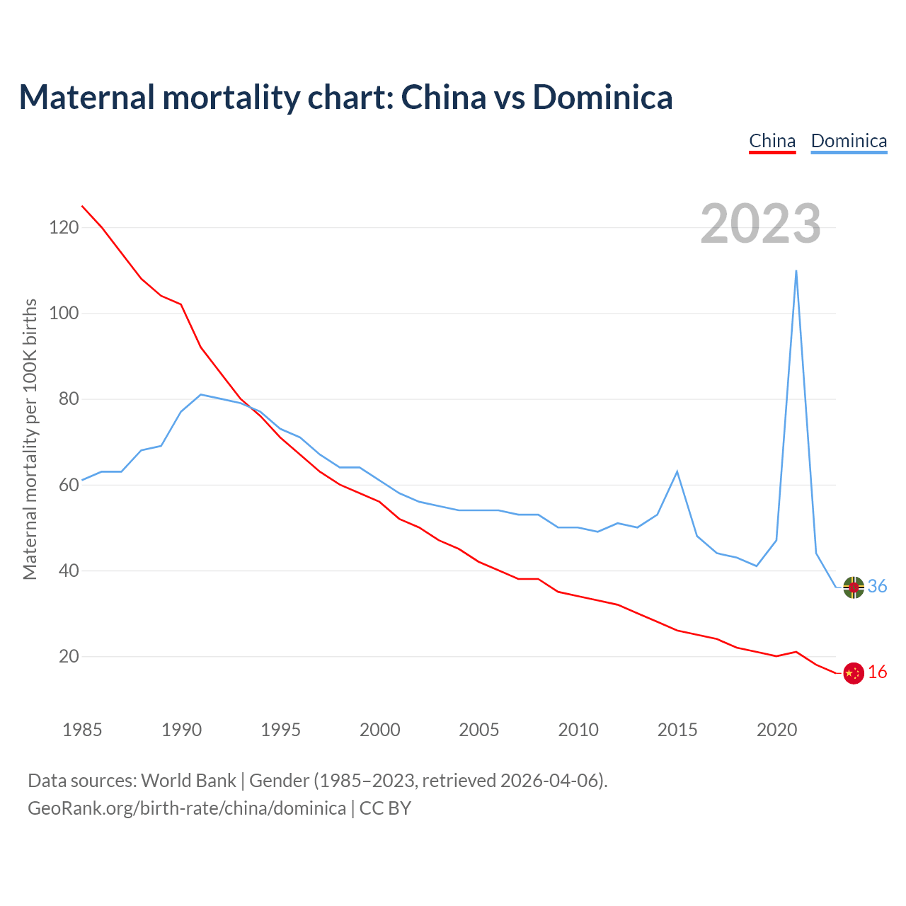 The maternal mortality rate, which is the probability of dying during childbirth or within 42 days of pregnancy termination, is 16 deaths per 100,000 live births in China, compared to 36 deaths in Dominica.