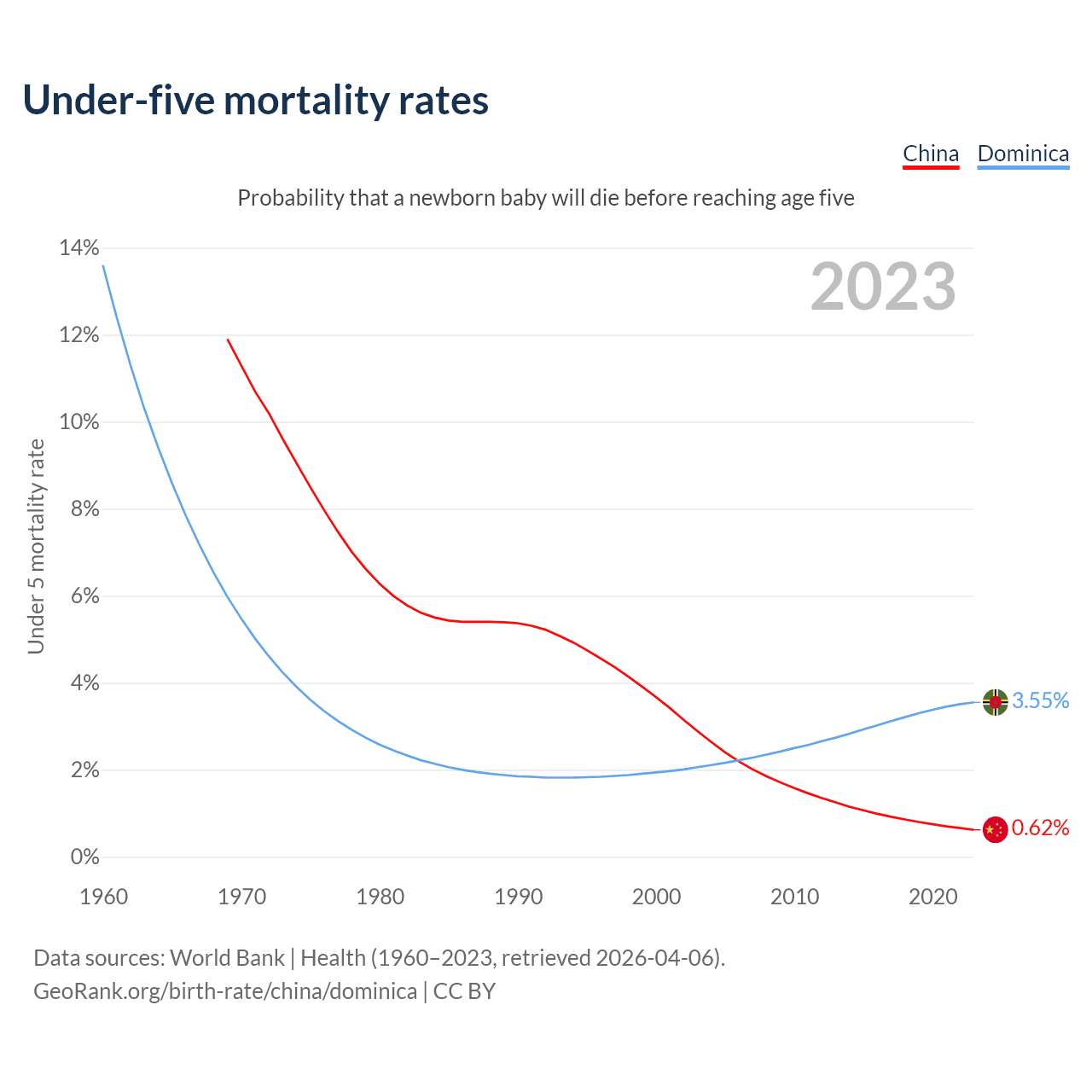 The chance that a newborn baby will die before reaching age five is 0.62% in China and 3.55% in Dominica. Above is a chart with historical data on under-five mortality rates.
