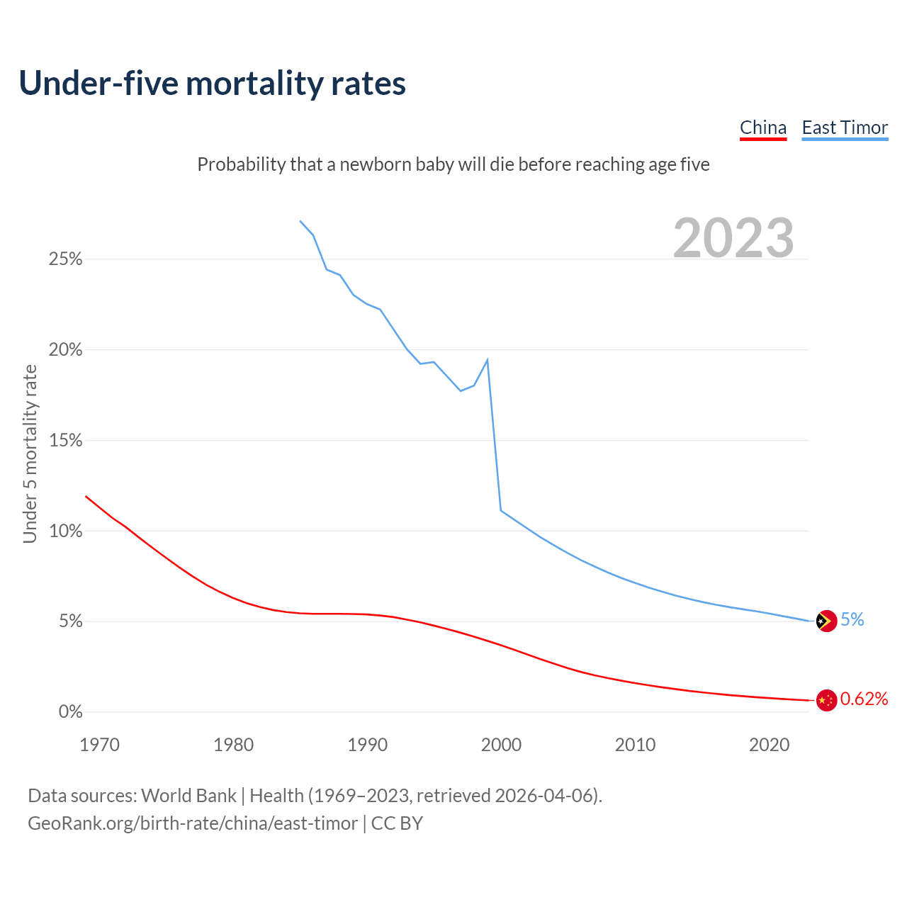 The chance that a newborn baby will die before reaching age five is 0.62% in China and 5% in East Timor. Above is a chart with historical data on under-five mortality rates.