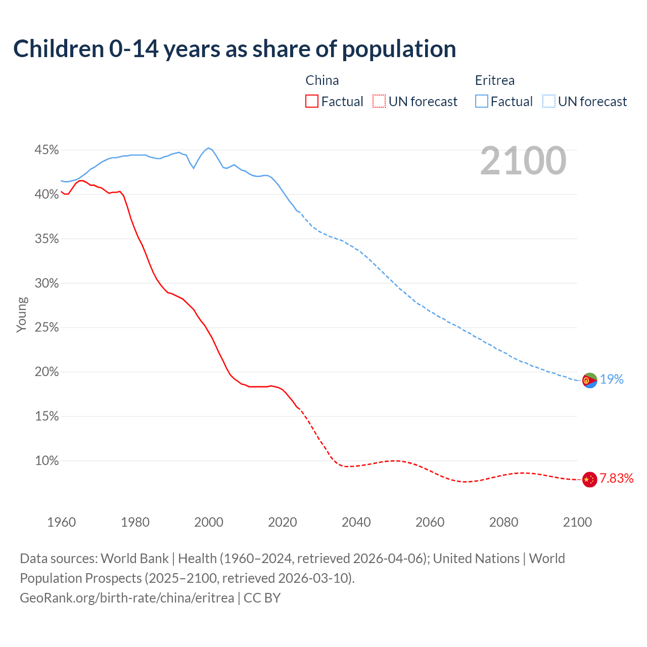 According to the latest available data on birth rates, the fertility rate in China was 1 children per woman in 2023, compared to 3.71 in Eritrea in 2023. The replacement level is considered to be 2.1 children per woman.