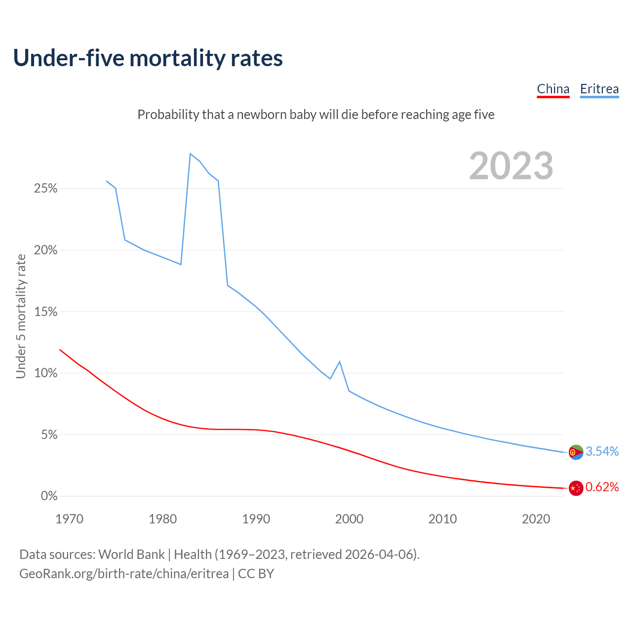 The chance that a newborn baby will die before reaching age five is 0.62% in China and 3.54% in Eritrea. Above is a chart with historical data on under-five mortality rates.